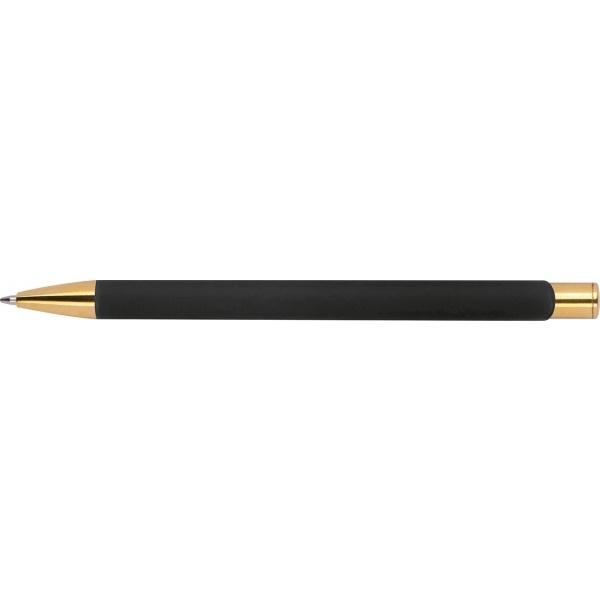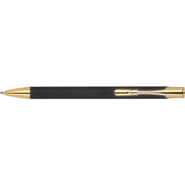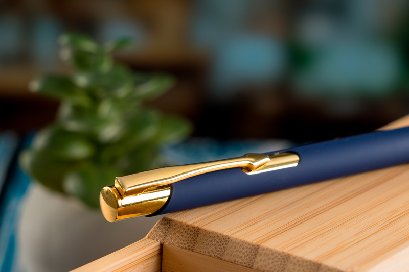 Alumiinista valmistettu kuulakärkikynä kullanvärisillä pinnoitteilla, kumiviimeistelyllä ja suurella kapasiteetilla kirjoitettavalla sinisellä täytteellä. Logosi laseroidaan leikkeen oikealle puolelle, se näkyy kullan värisenä.