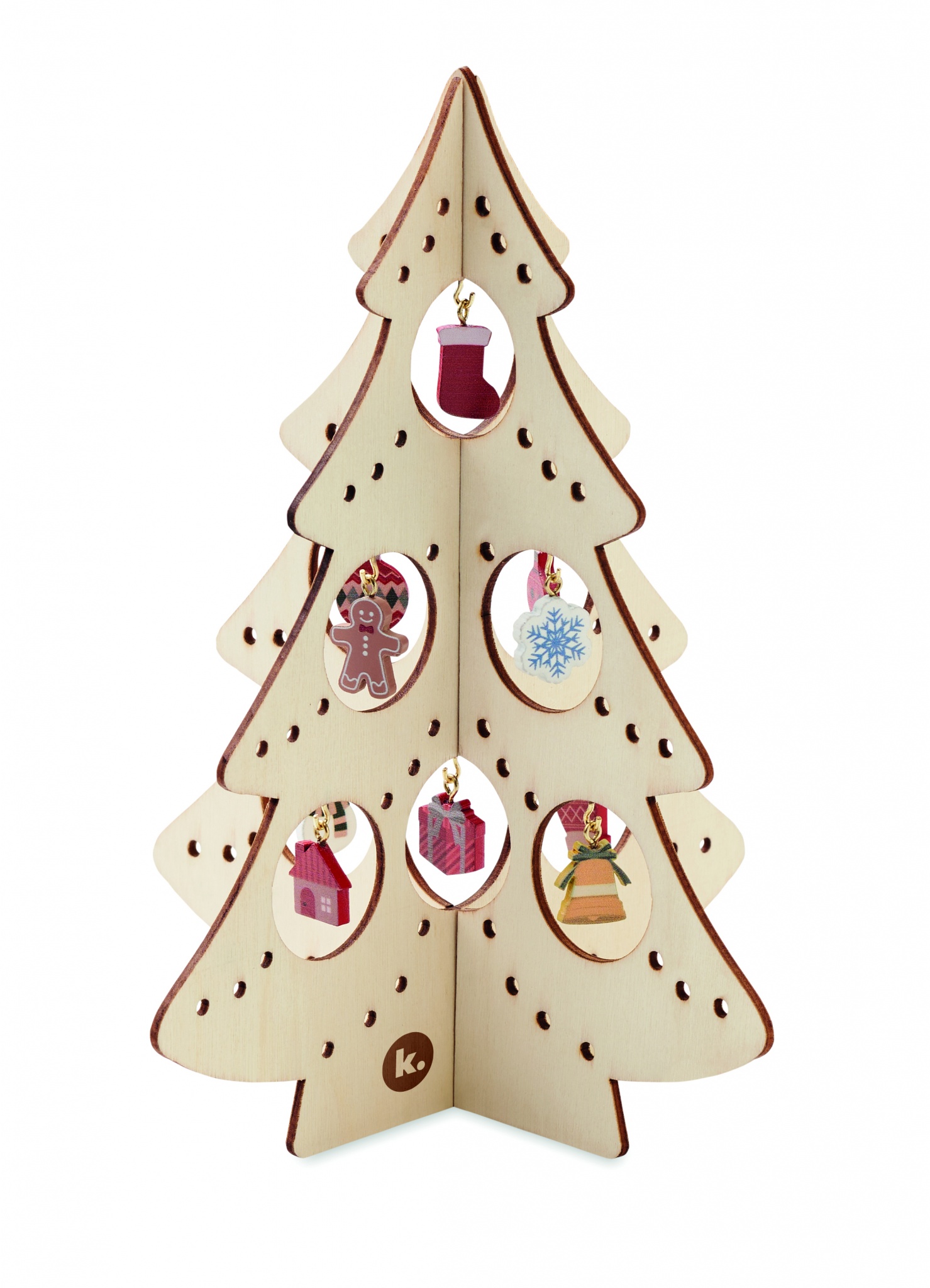 Vanerista valmistettu siluettijoulukuusi, 10 erilaisella koristeella. Itse koottava.