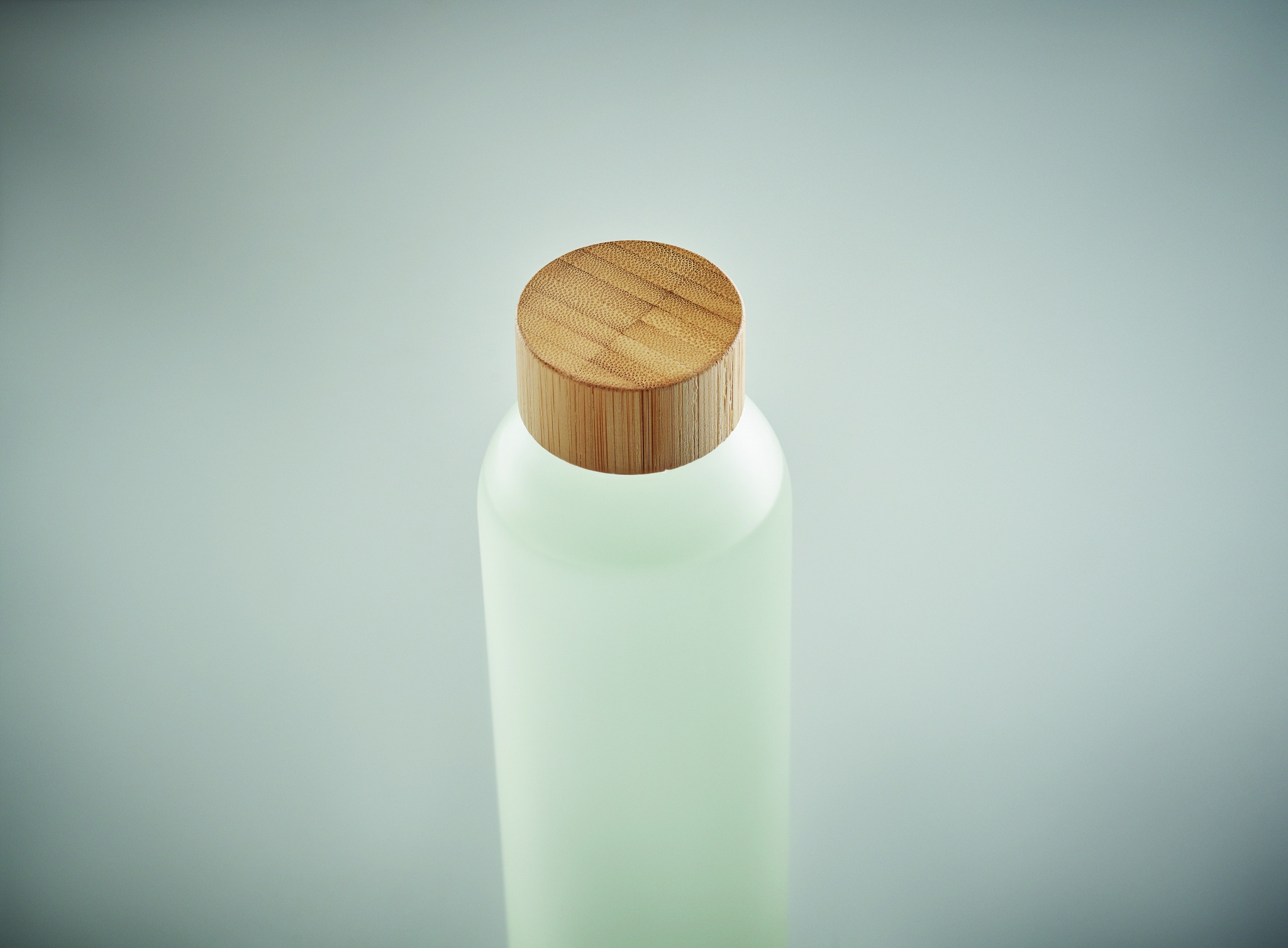 Lasinen juomapullo, jossa on erityinen pinnoite sublimaatiota varten sekä bambukorkki. Tilavuus 650 ml.