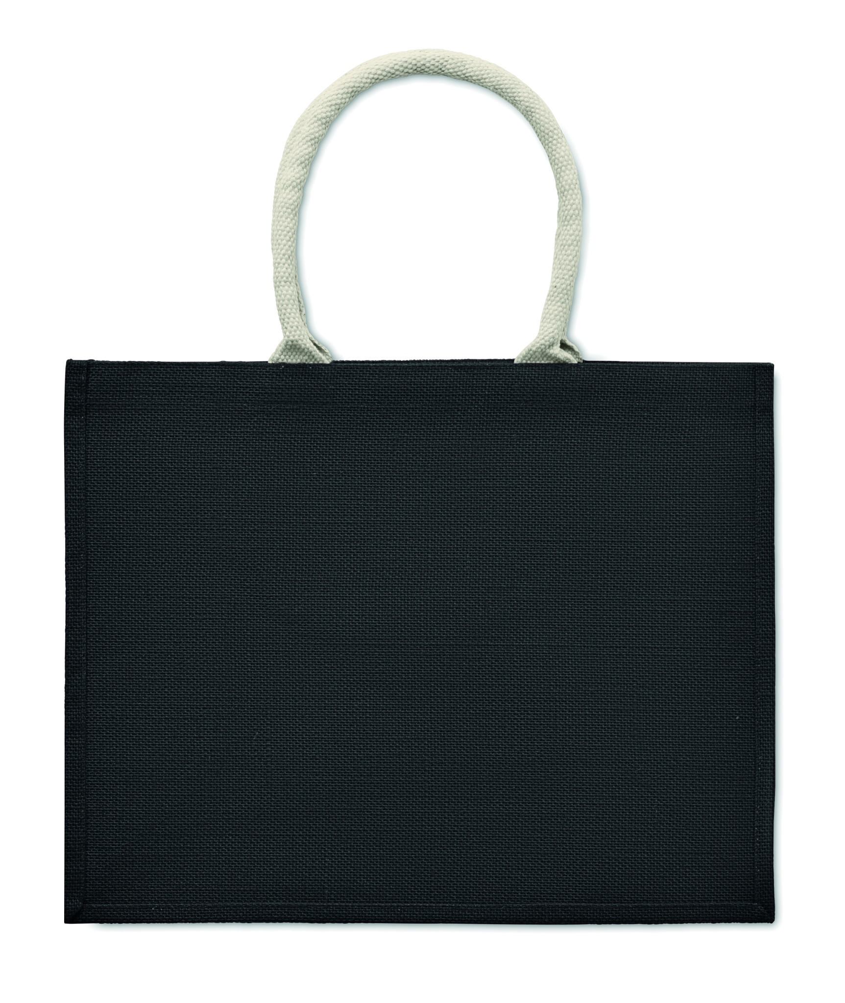 Laminoitu juuttilaukku lyhyillä puuvillakahvoilla. Täydellinen ostoskassiksi taikka rantalomalle, maksimi kanto painoraja 2,5 kiloa.