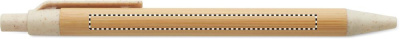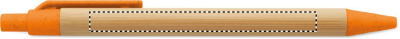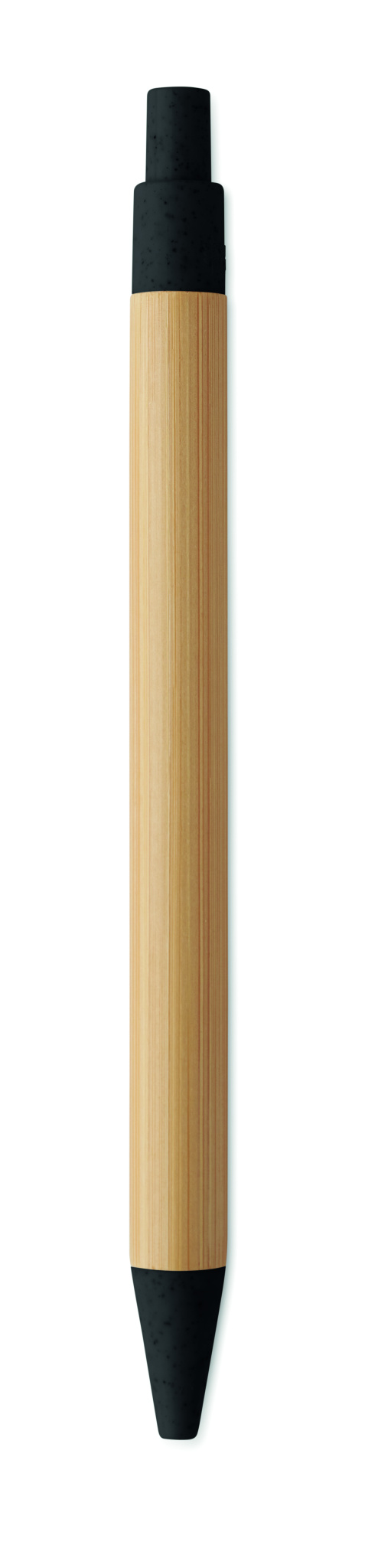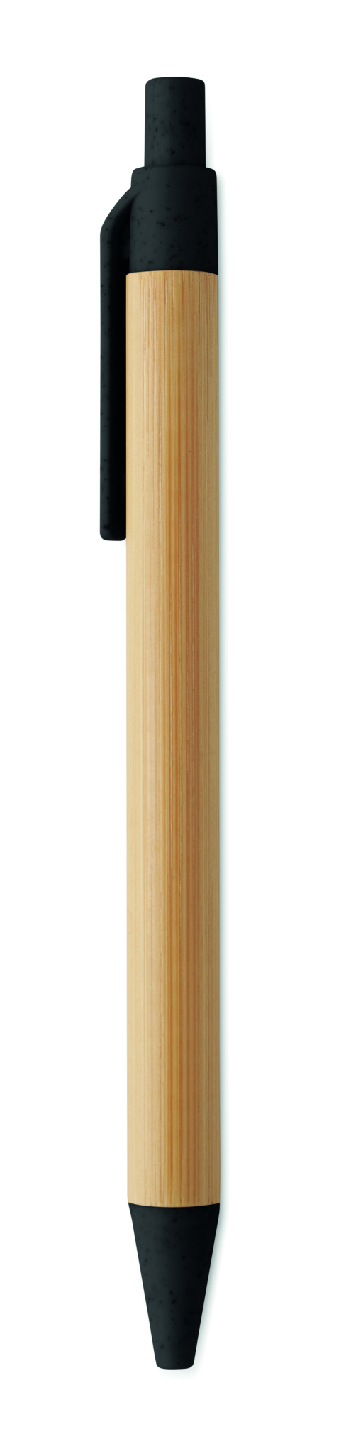 Kuulakärkikynä, jossa bamburunko, vehnäolkea (50 %) ja ABS-muovia (50 %) olevat kiinnikkeet. Sininen muste.