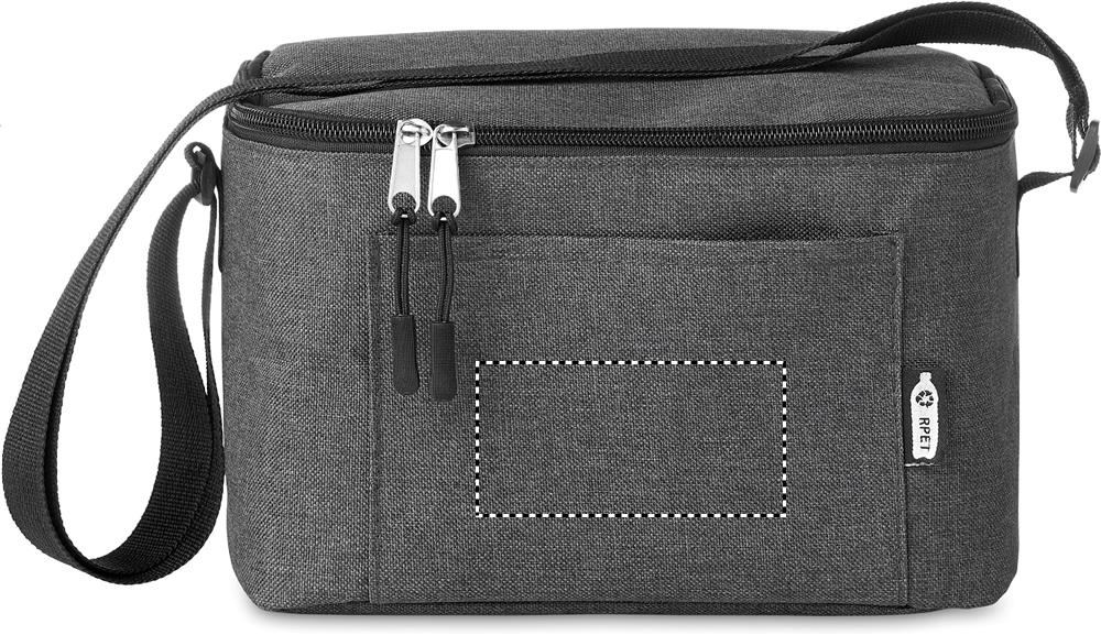 3 litran 2- sävyinen 600D RPET kylmälaukku 6 tölkille, edessä tasku. Eristysmateriaalina 0,15mm EVA ja 3mm vaahtomuovia.