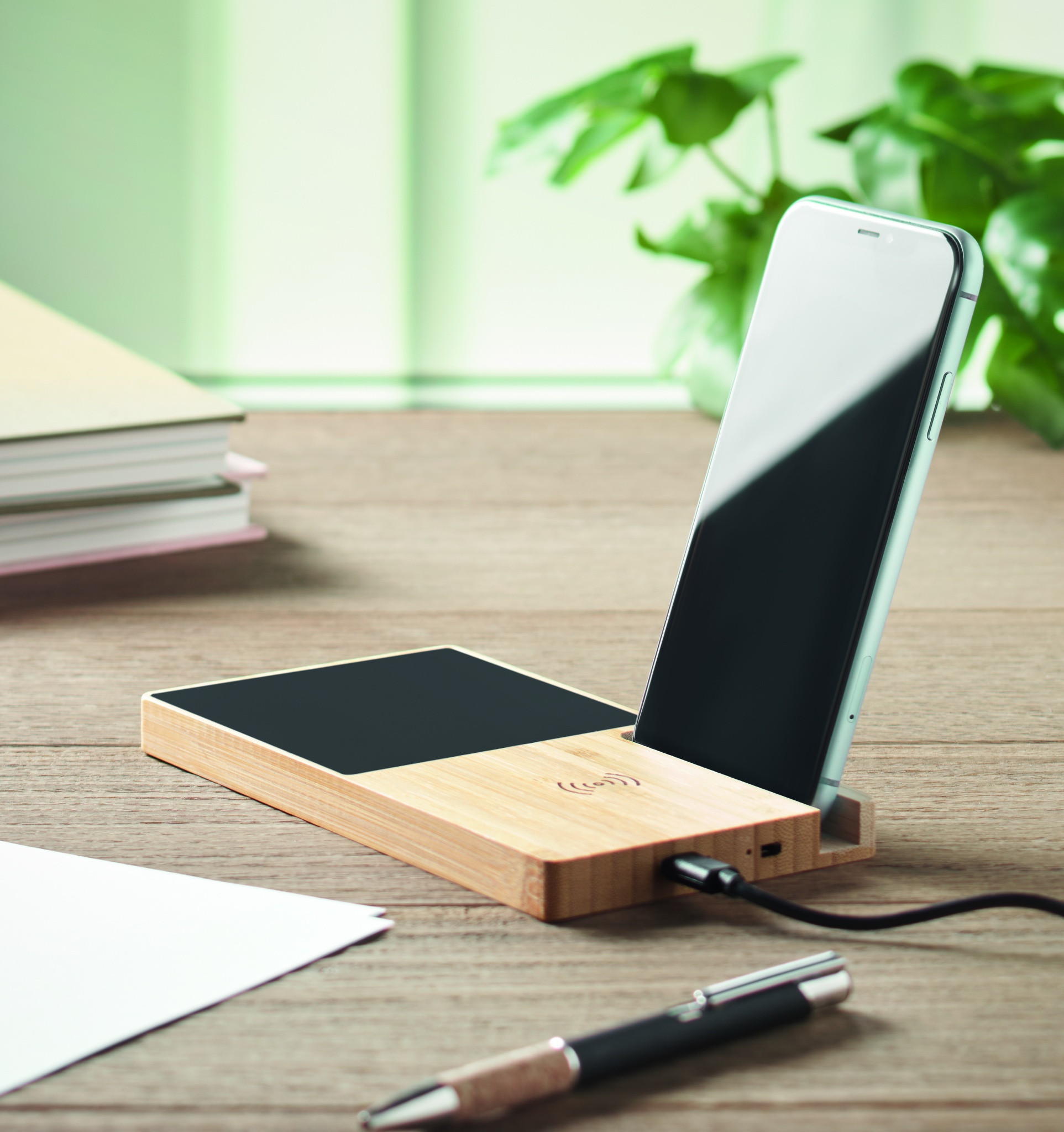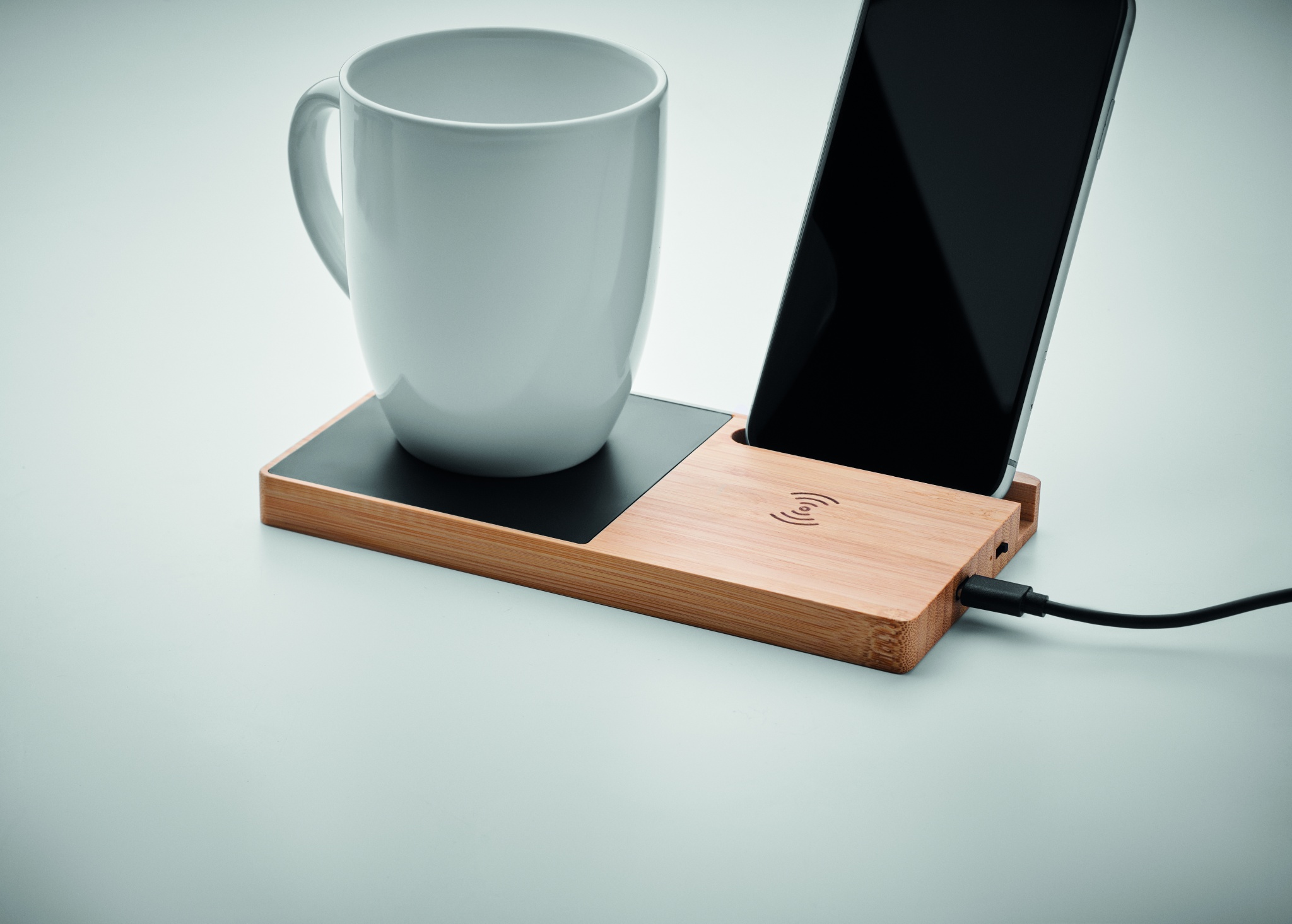 Bambusta tehty langaton laturi , jossa on mukinlämmitin ja puhelinteline. Liitä laite tietokoneeseen, aseta älypuhelin sen päälle ja anna sen latautua. Lähtö: DC 9V/1.67A (15W). Yhteensopiva uusimpien androidien, iPhone® 12, X ja uudempien kanssa.