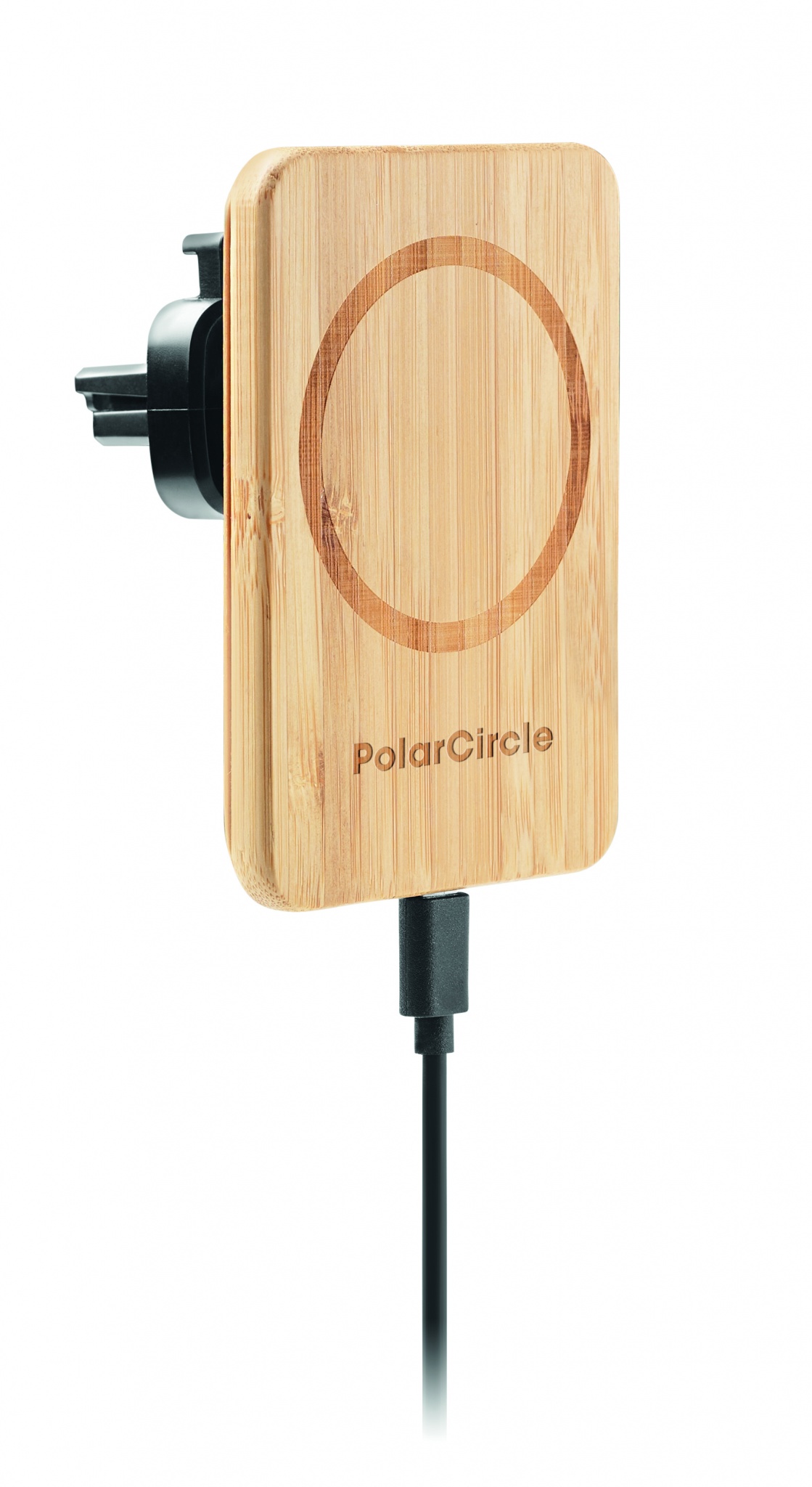 Magneettinen bambusta valmistettu langaton laturi, autokiinnikkeellä. Lähtövirta DC 9V/1,67A (15W) pikalataukseen. Yhteensopiva iPhone® 12 ja uudempien laitteiden kanssa. Sisältää ylimääräisen magneettisen metallirenkaan, tukemaan muiden ei-magneettisten langattomasti ladattavien puhelimien lataamista.