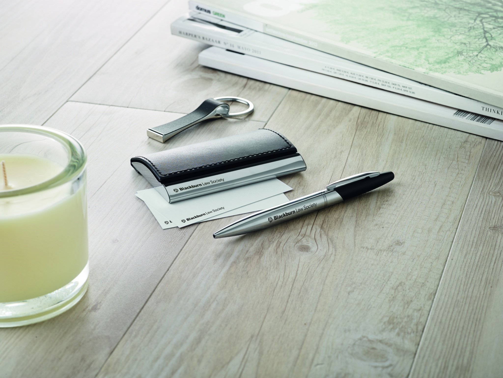 Liikelahja setti, sisältää metallisen kuulakärkikynän mustalla musteella, avaimenperän ja käyntikorttikotelon, pakattuna lahjalaatikkoon.