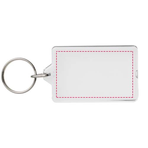 Kirkas suorakaiteenmuotoinen G1-avaimenperä, jossa on metallinen avainrengas. Tämän avaimenperän voi avata kolikolla. Metallirengas tekee profiilista litteän, mikä on ihanteellista postituksen kannalta. Tulosteinsertin mitat: 5,0 cm x 3,0 cm.