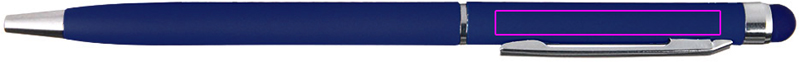 Ruostumattomasta teräksestä valmistettu kuulakärkikynä, jossa on sinikirjoitus muovitäyttö ja värisovitettu kosketustoiminto pidikkeen yläpuolella. Kaiverramme logosi klipsien alle.