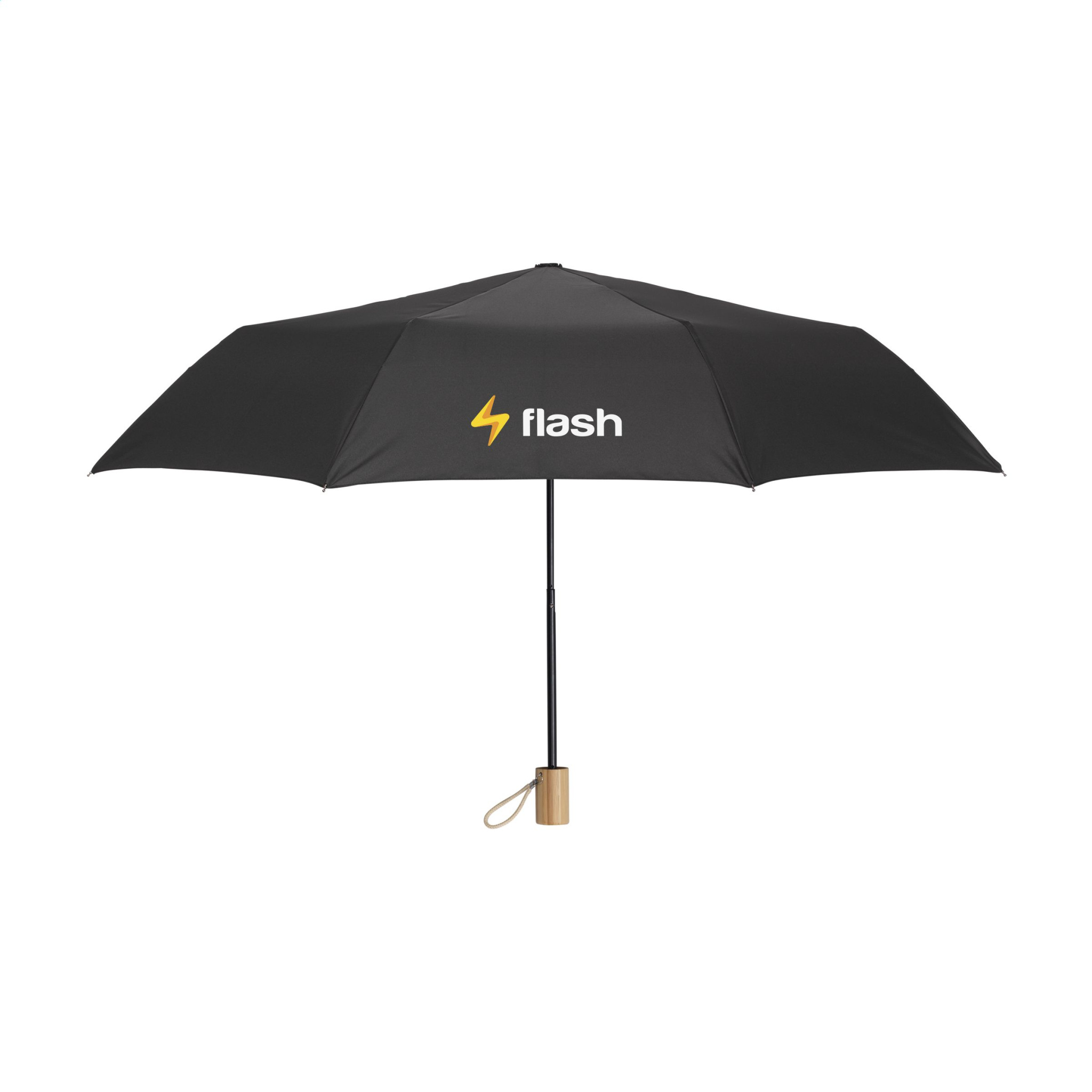 Vau! Taitettava sateenvarjo 190T RPET pongee polyesterista. Ruostumattomasta teräksestä valmistettu varsi ja runko, kaunis bambukahva puuvillalenkillä, tarrakiinnitys, säilytyspussi ja RPET-tarra. Manuaalinen käyttö. RCS-sertifioitu. Kierrätysmateriaalia yhteensä: 18 %.
