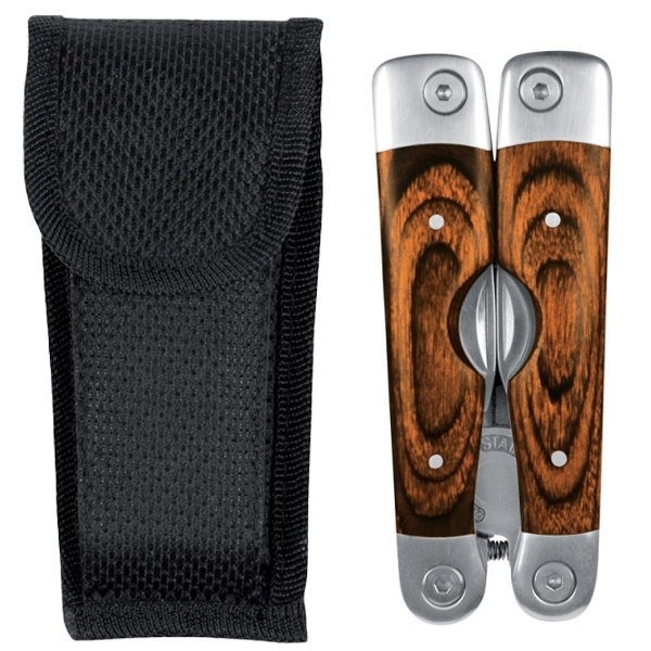 Ruostumattomasta teräksestä valmistettu monitoimityökalu, jossa tyylikkäät puukuoret kahvoissa: isot pihdit leikkaustoiminnolla, pieni saha mittayksiköllä ja viilalla, veitsi, Phillips-ruuvimeisseli, kolme eri leveyttä ruuvimeisseliä, pieni veitsi kaapelieristeen poistoaineella ja tölkinavaaja. Monitoimityökalu toimitetaan vyöpussissa, joten voit aina kuljettaa sitä mukanasi. Kaiverremme logosi kahvaan.
