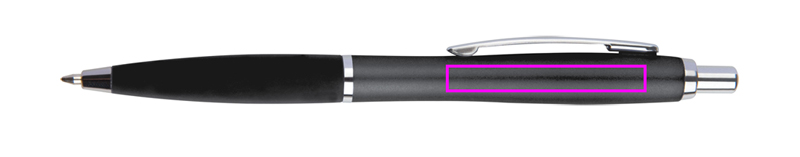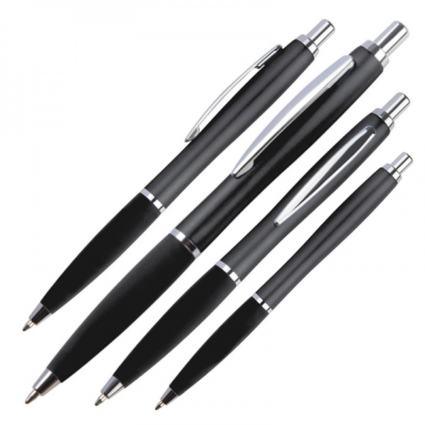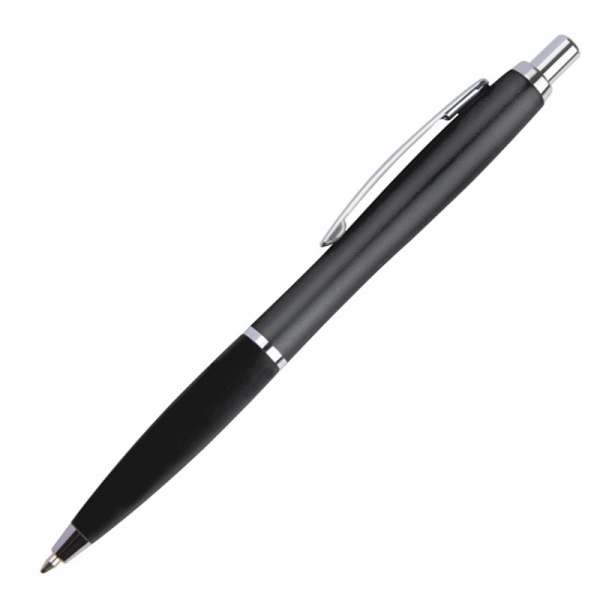 Ohut muovinen kuulakärkikynä, jossa on sinikirjoitus muovitäyttö ja kumitettu otealue. Logosi painetaan klipin alle.