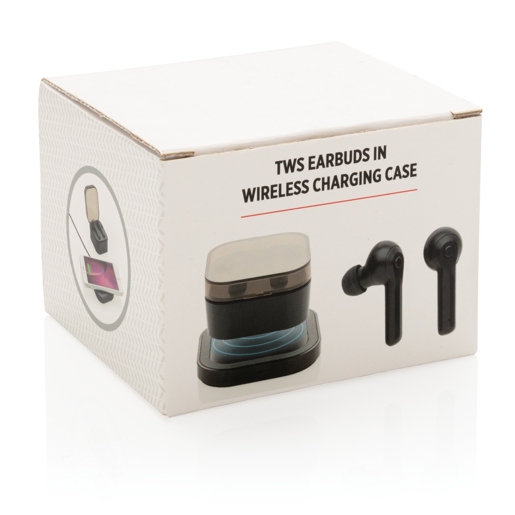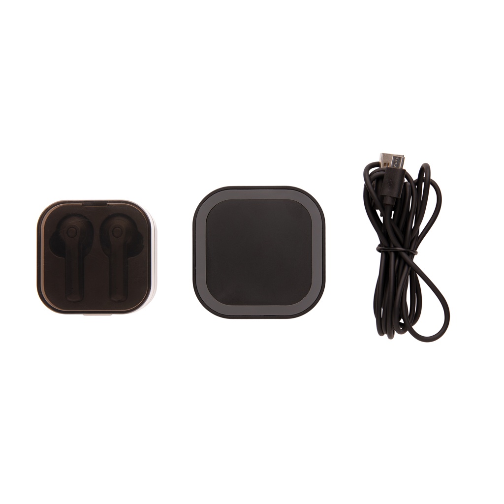 Logo trade mainostuote kuva: Mustat TWS-kuulokkeet ja langaton latauskotelo