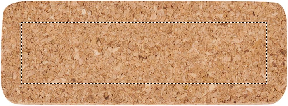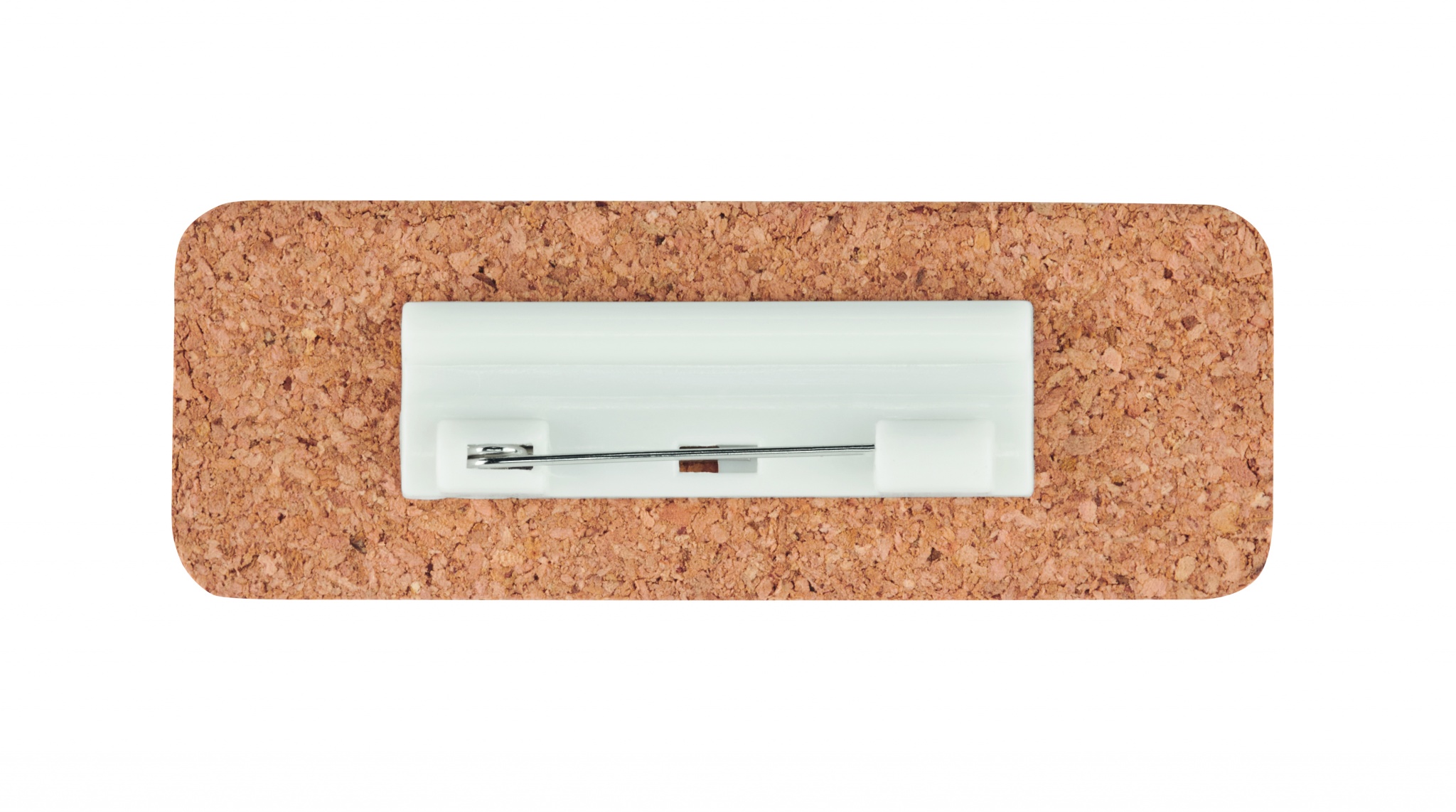 Korkista valmistettu nimikyltti, jossa on neulakiinnitys. Korkki on luonnonmateriaali, strukturaalinen laatu ja pinnan huokoisuus voi aiheuttaa eroavaisuuksia tuotteissa painatuksen jälkeen.