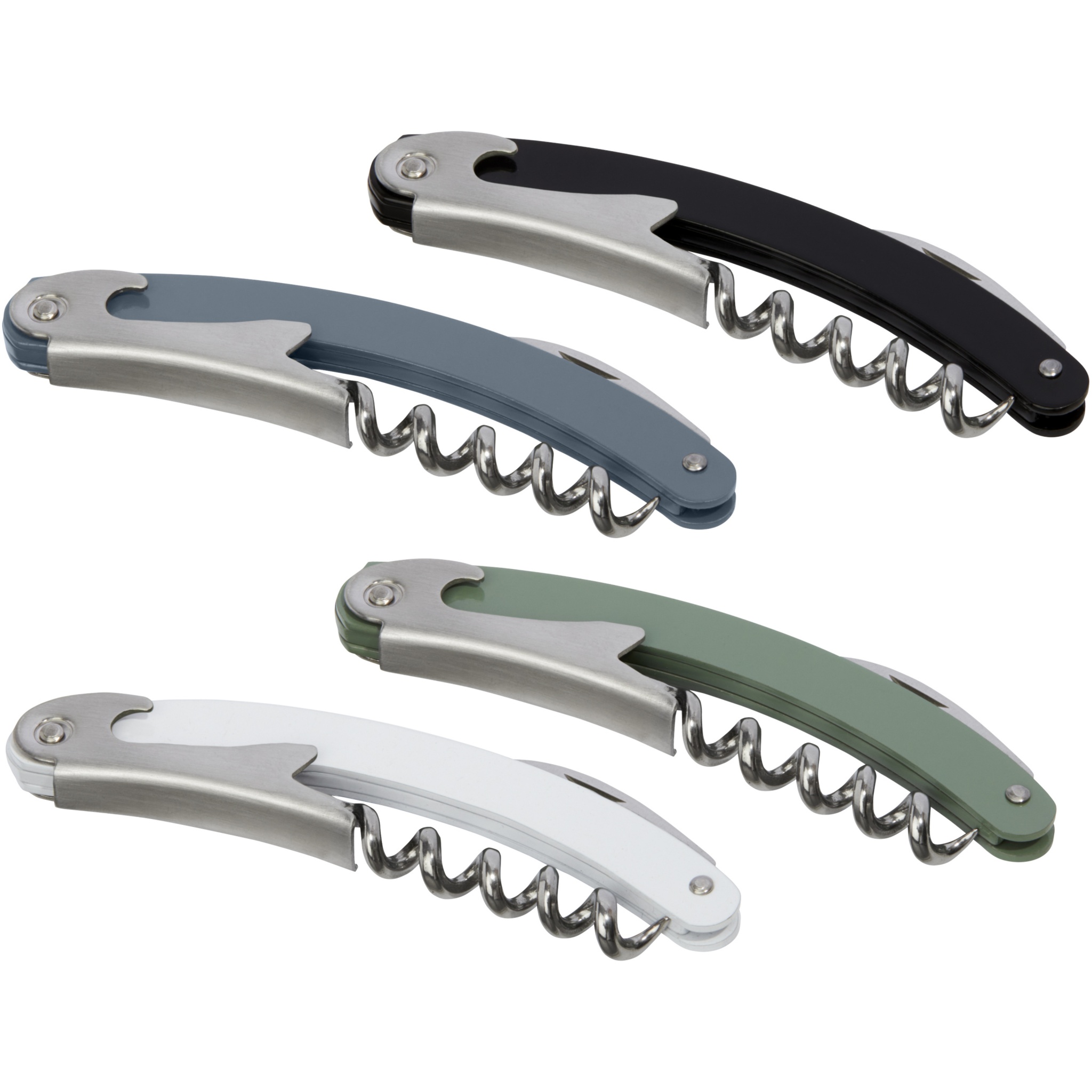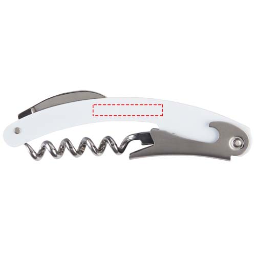 Ruostumattomasta teräksestä valmistettu tarjoilijanveitsi, jossa on värillinen runko, folioleikkuri ja pullonavaaja.