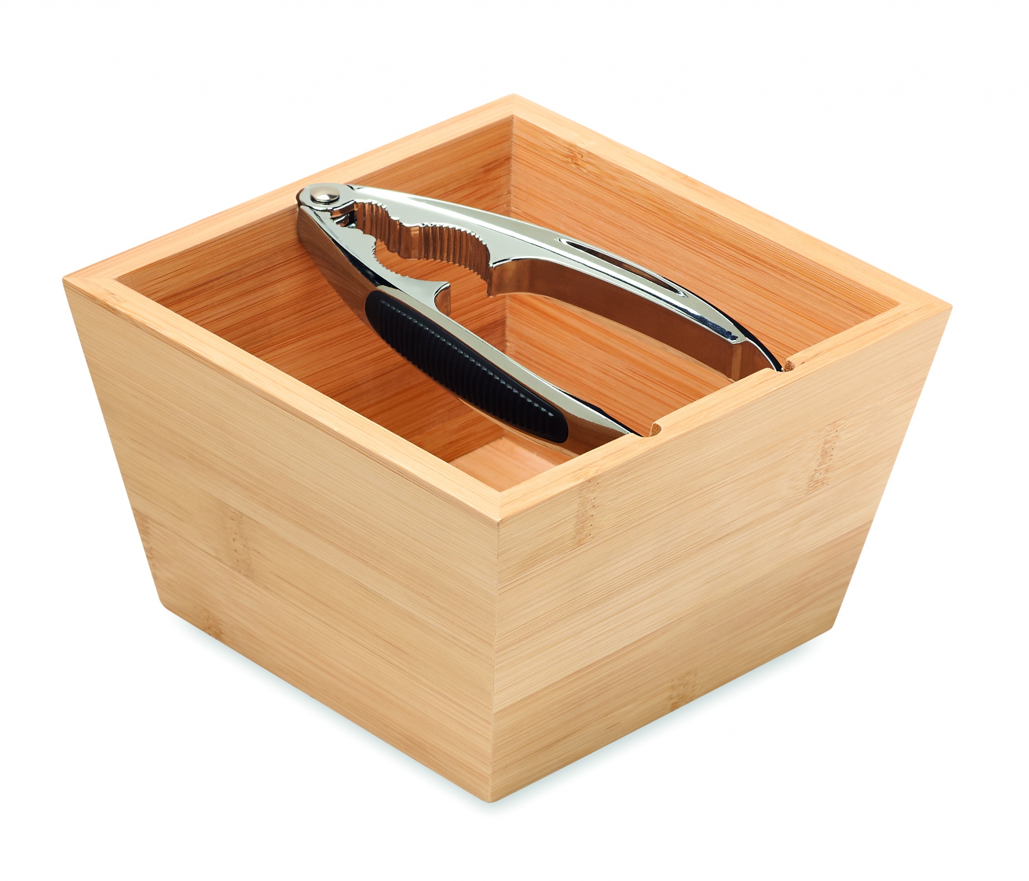 Pähkinänsärkijäsetti bambu rasialla ja hopean värinen pähkinänsärkijä TPR kahvalla.