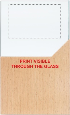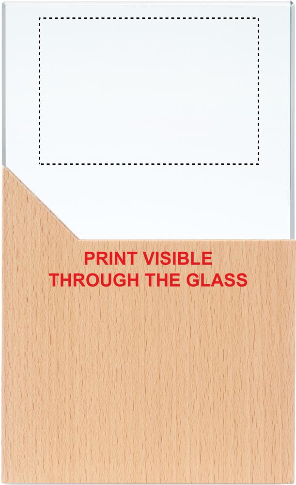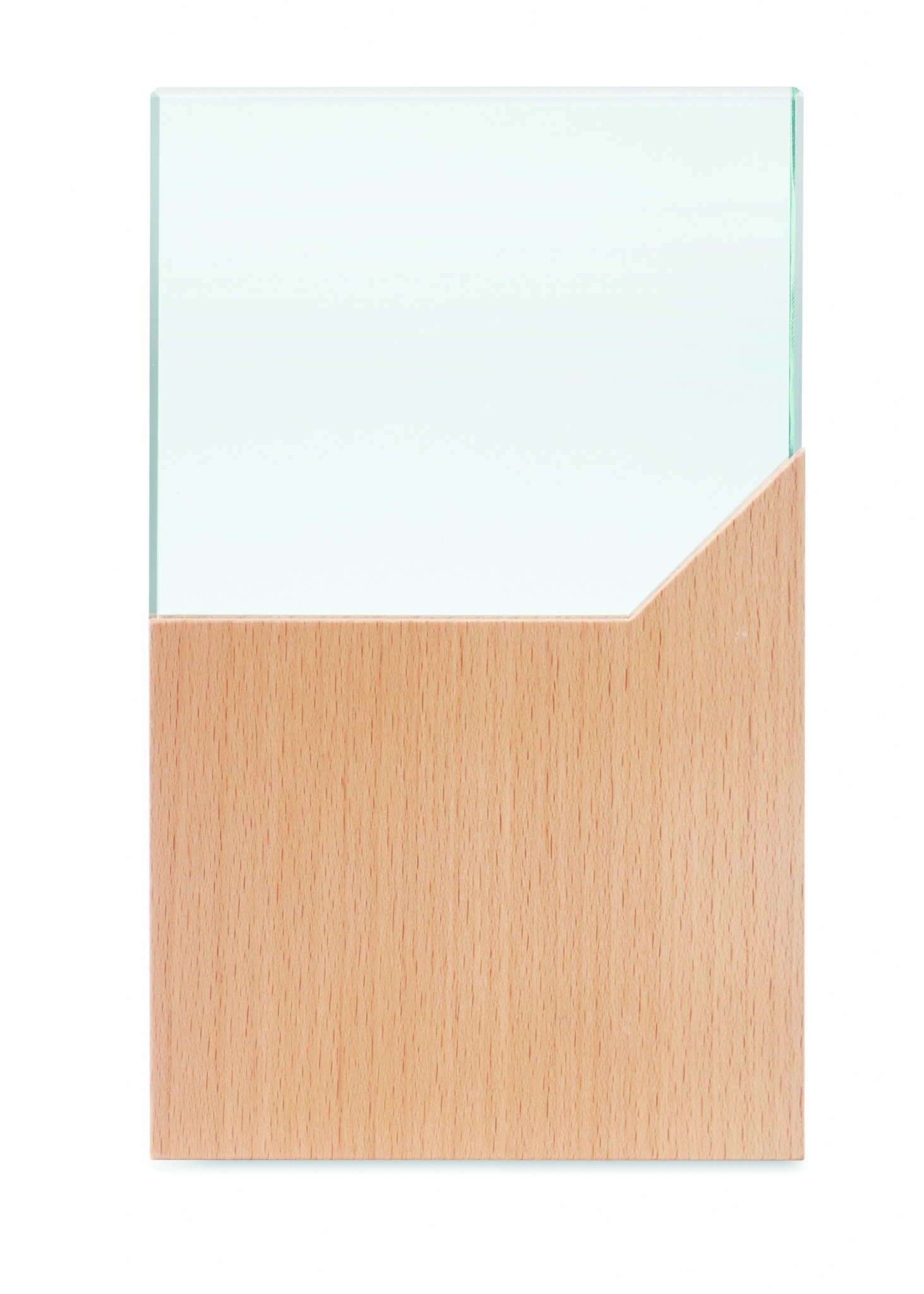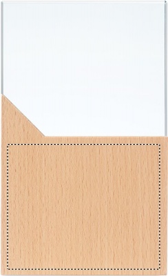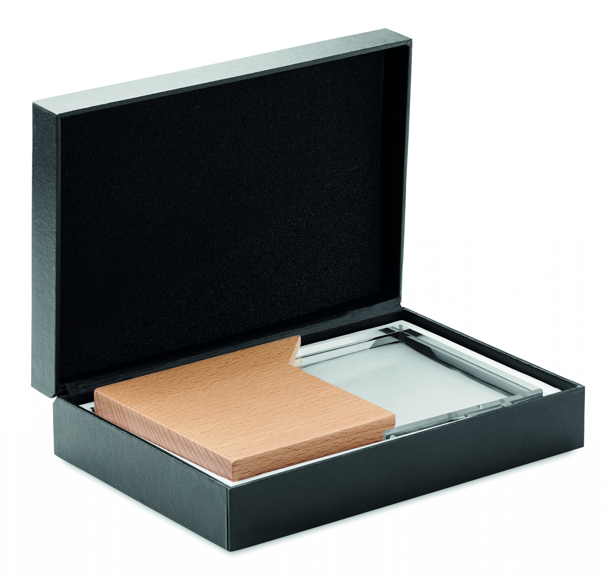 Kristallipalkinto tai muistolaatta pyökkipuujalustalla, pakattuna lahjapakkaukseen.