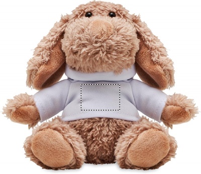 Koira pehmolelu, jolla on hupullinen paita. Ihanteellinen sublimaatiopainatusta varten.