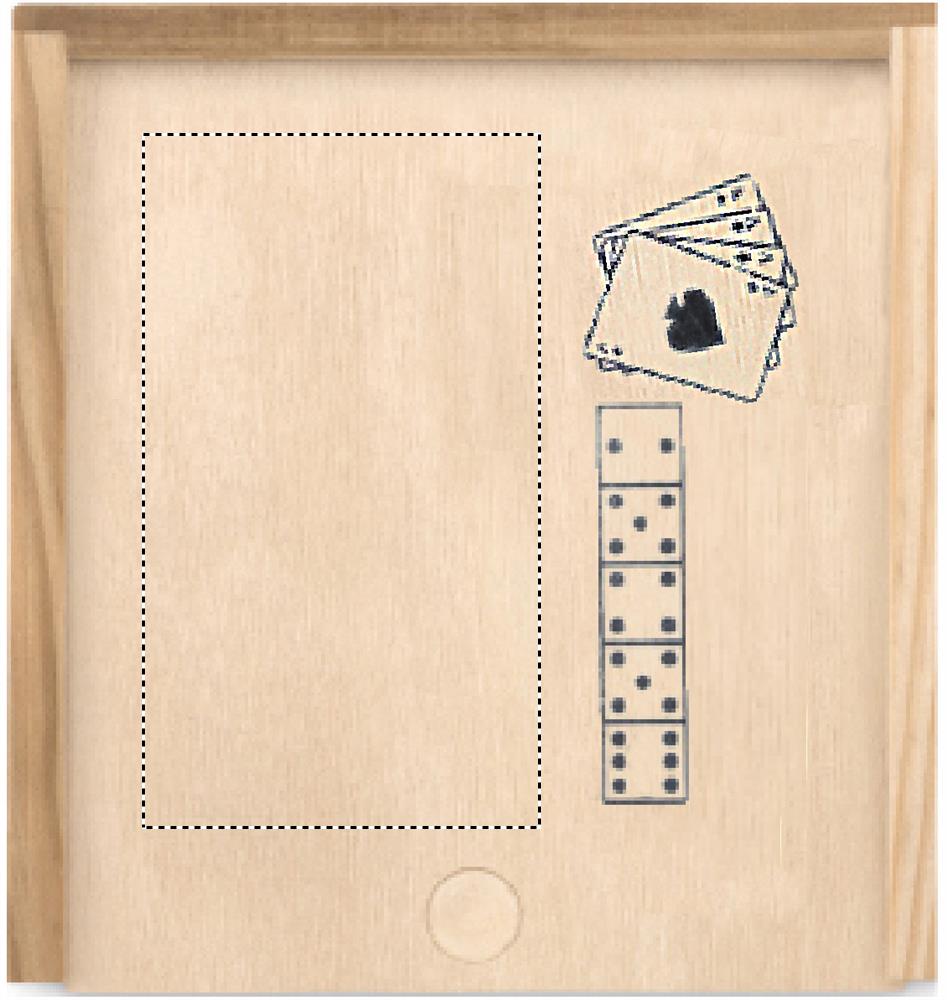 Pelisetti, sisältää 54 pelikorttia ja 5 noppaa, pakattuna puulaatikkoon.
