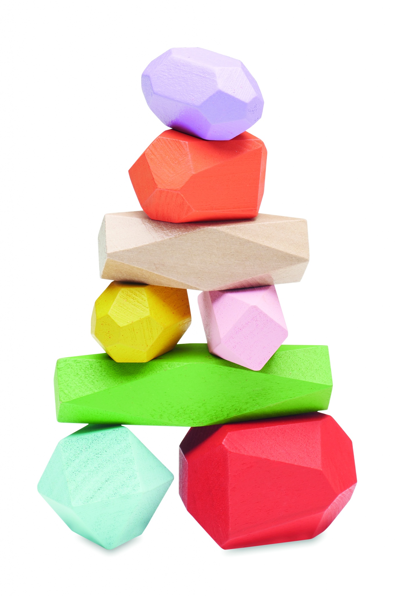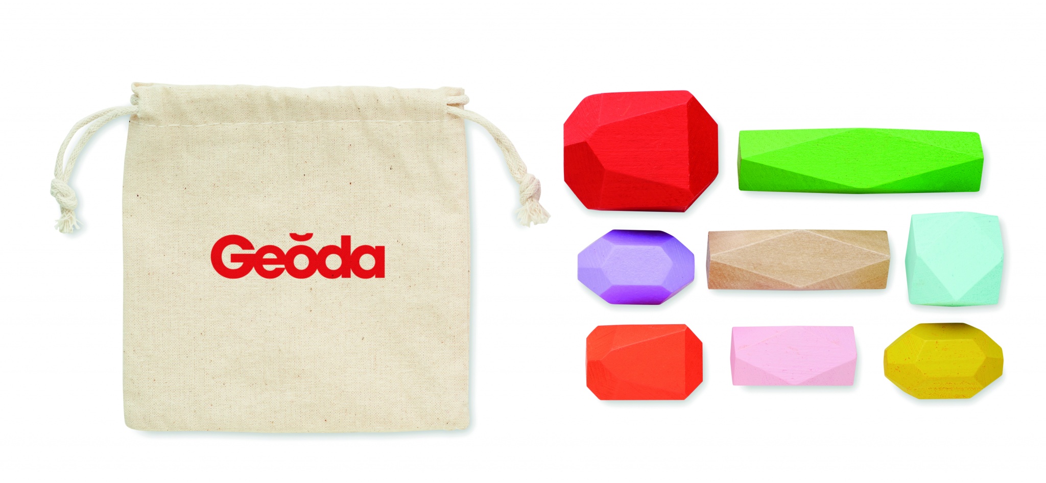 Kahdeksan värillistä, puusta tehtyä pinottavaa kiveä puuvillapussissa.