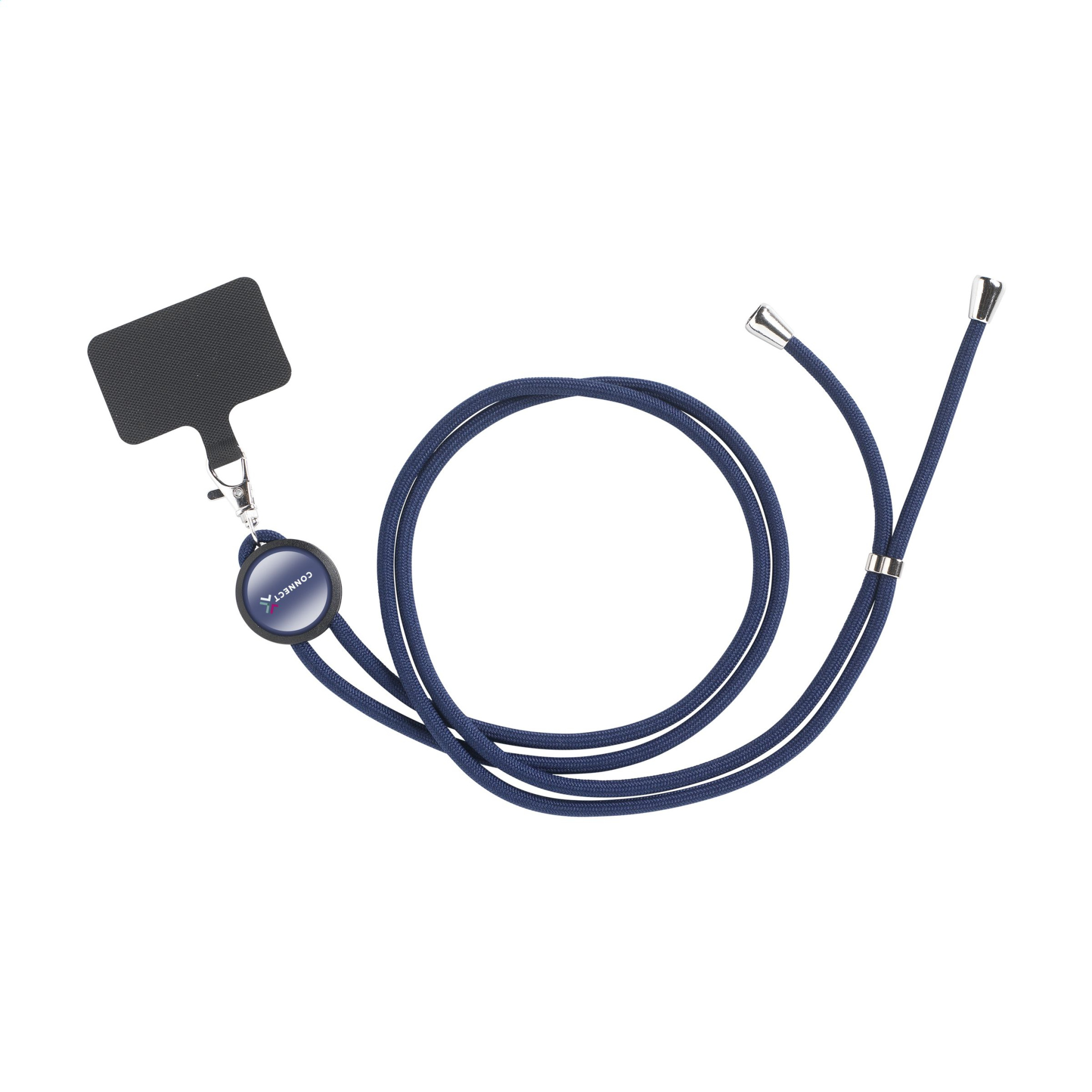 Säädettävä puhelinnauha pyöreällä johdolla, joka on valmistettu 100 % GRS RPET polyesterista. Metallinen karabiini, alumiininen säädettävä lenkki ja tulpat sekä kierrätysmuovista valmistettu pyöreä etiketti. Yleispatch mahdollistaa älypuhelimen kiinnittämisen kaulanauhaan. Tämän yhdistelmän avulla voit kuljettaa älypuhelintasi turvallisesti kaulassasi. Tämä varmistaa, että sinulla on puhelin nopeasti käsillä ja voit pitää kätesi ja vaatetaskut vapaina. Tämä patch on yhteensopiva useimpien älypuhelinten ja koteloyhdistelmien kanssa, mutta ei koteloiden kanssa, joissa on avoin pohja. Järjestelmä on suunniteltu siten, että puhelimesi latausportti ei ole tukossa. GRS-sertifioitu. Kierrätysmateriaali yhteensä: 40 %.