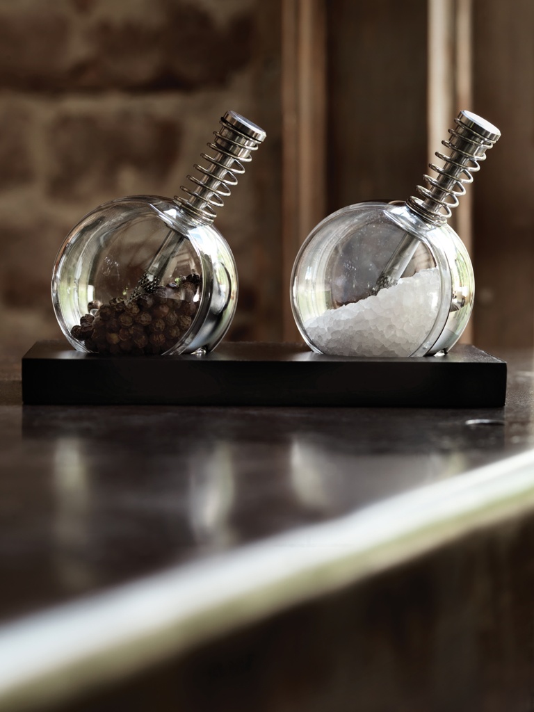 Hauskat pallonmuotoiset maustemyllyt, akryylia, kumipintaisella alustalla. Rekisteröity designtuote®