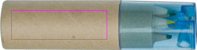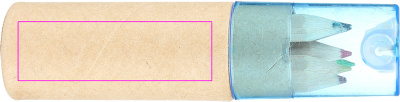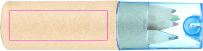 Pahvilaatikko, jossa kuusi lyhyttä, paksua värikynää ja integroitu teroitin sinisellä läpinäkyvällä muovikannella. Painamme logosi laatikkoon.