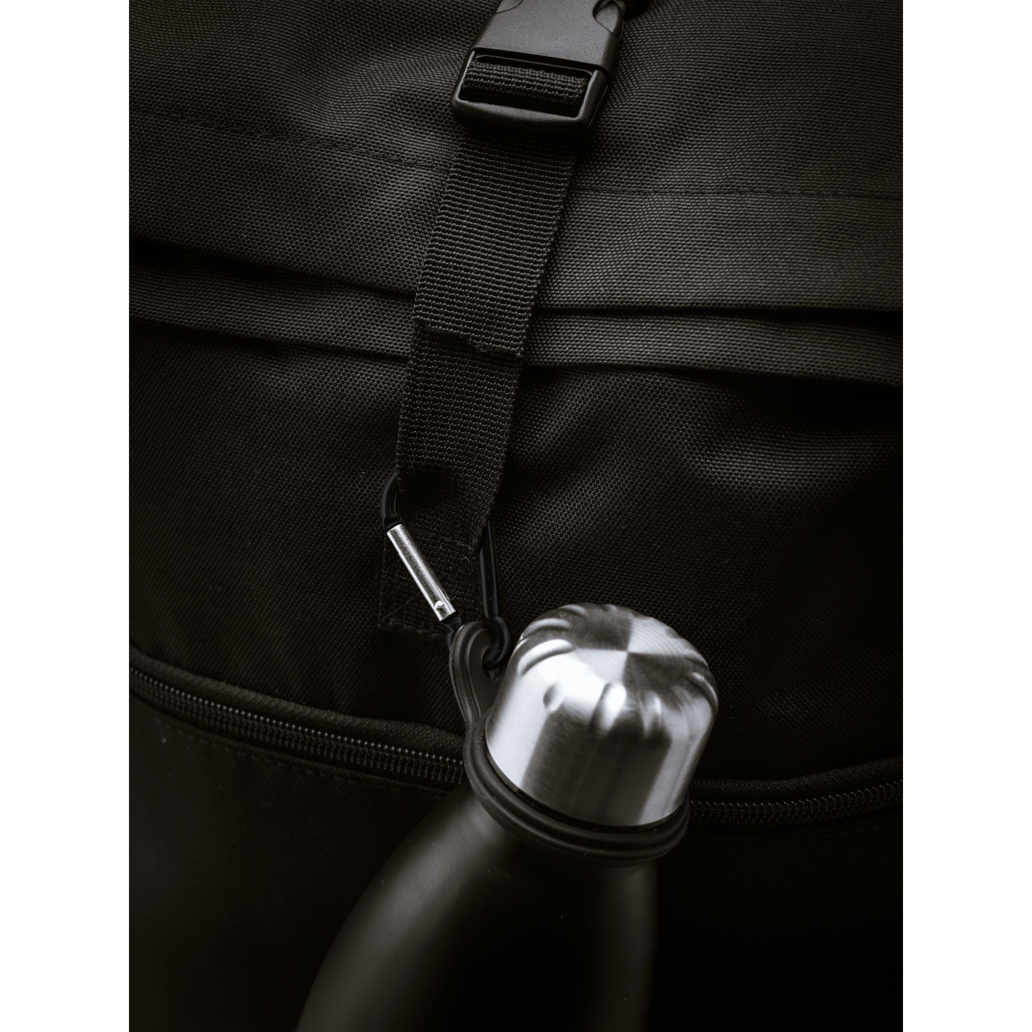 Silikonilenkki, jossa karabiini. Kiinnitä joustava lenkki juomapulloon, jotta pullo voidaan kiinnittää reppuun tai urheilukassiin karabiinihaarukalla.