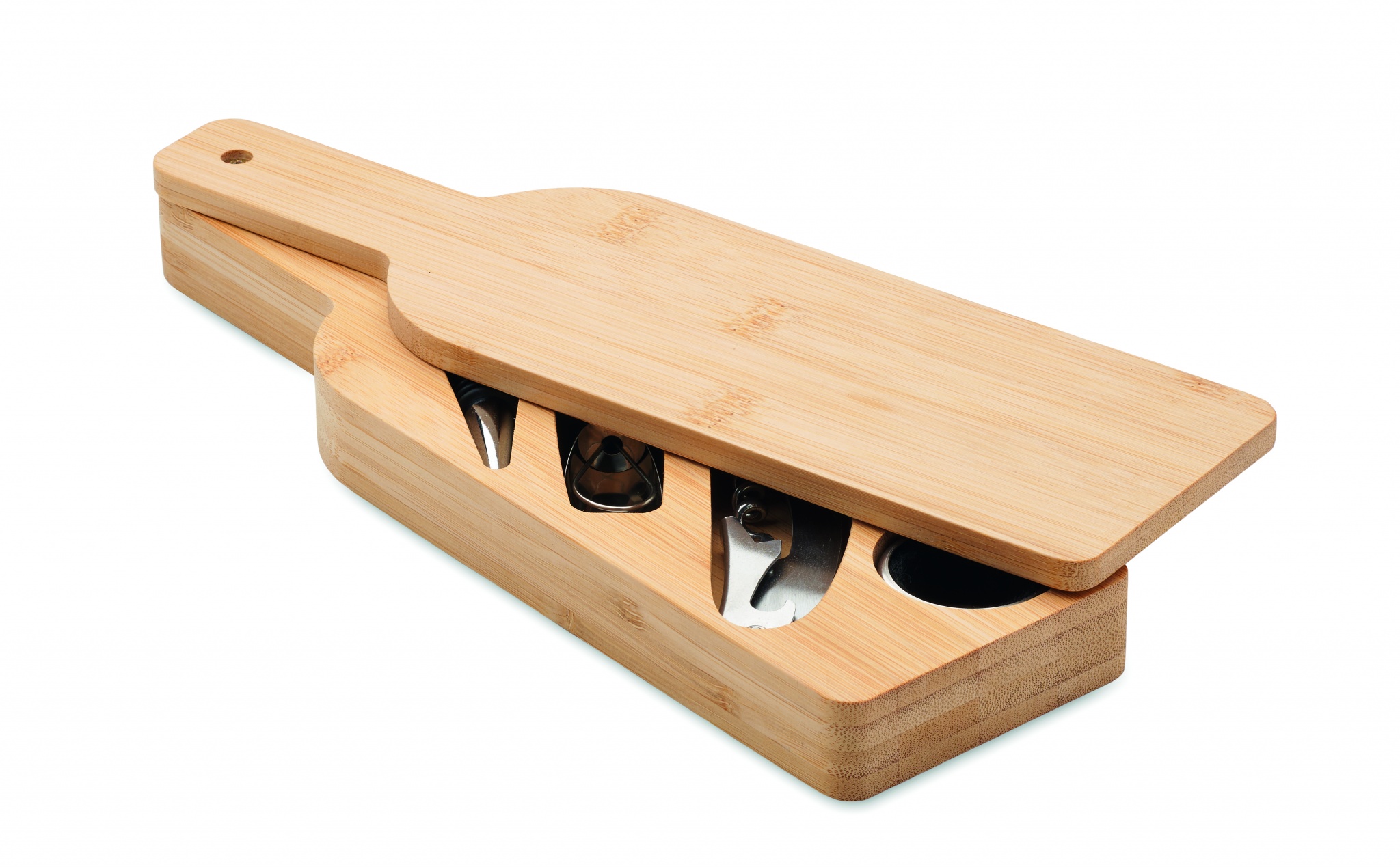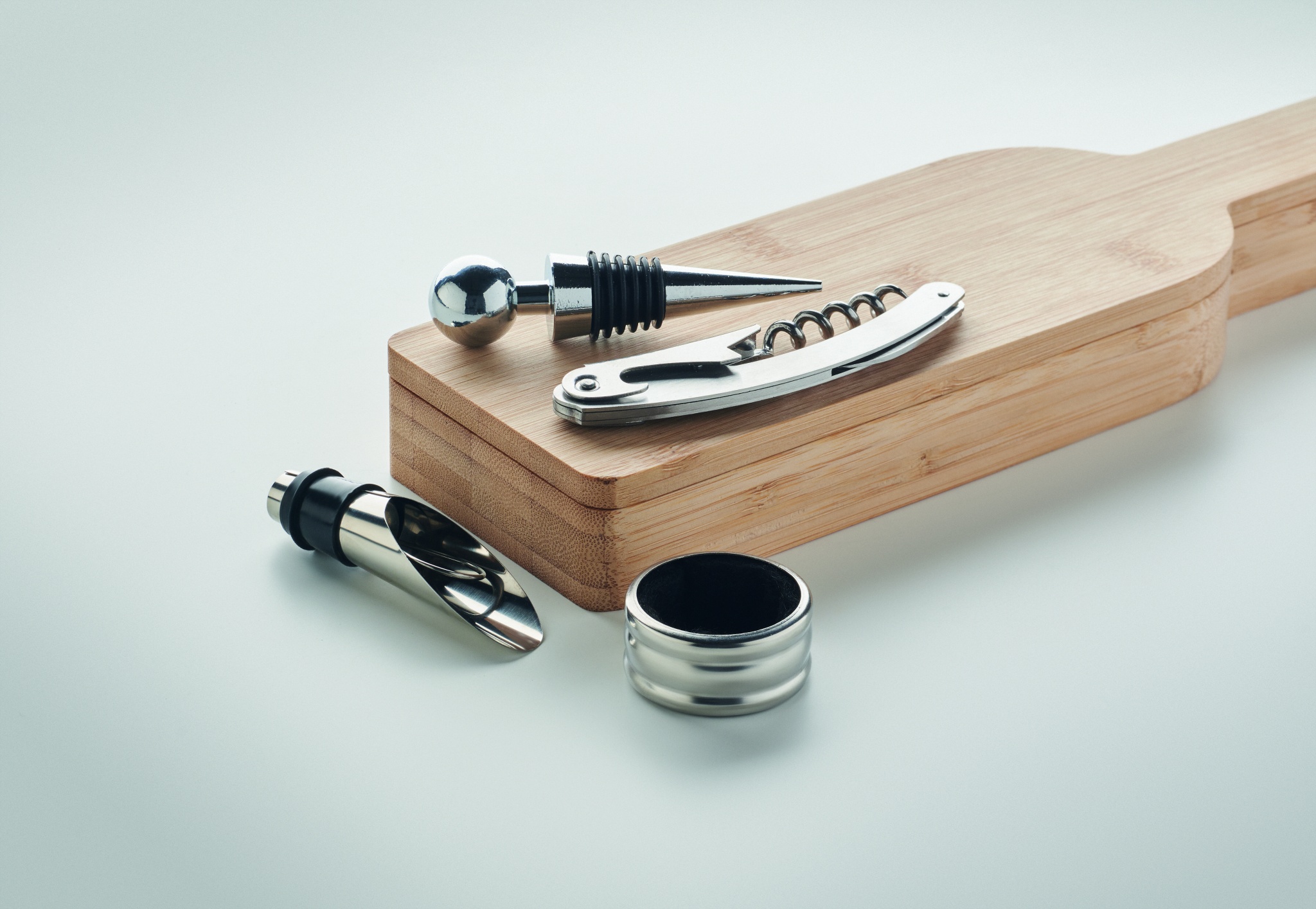 Pullon muotoinen viinisetti bambukotelossa. Sisältää korkkiruuvin, kaatonokan, pullonkorkin ja viinipullon tipparenkaan.