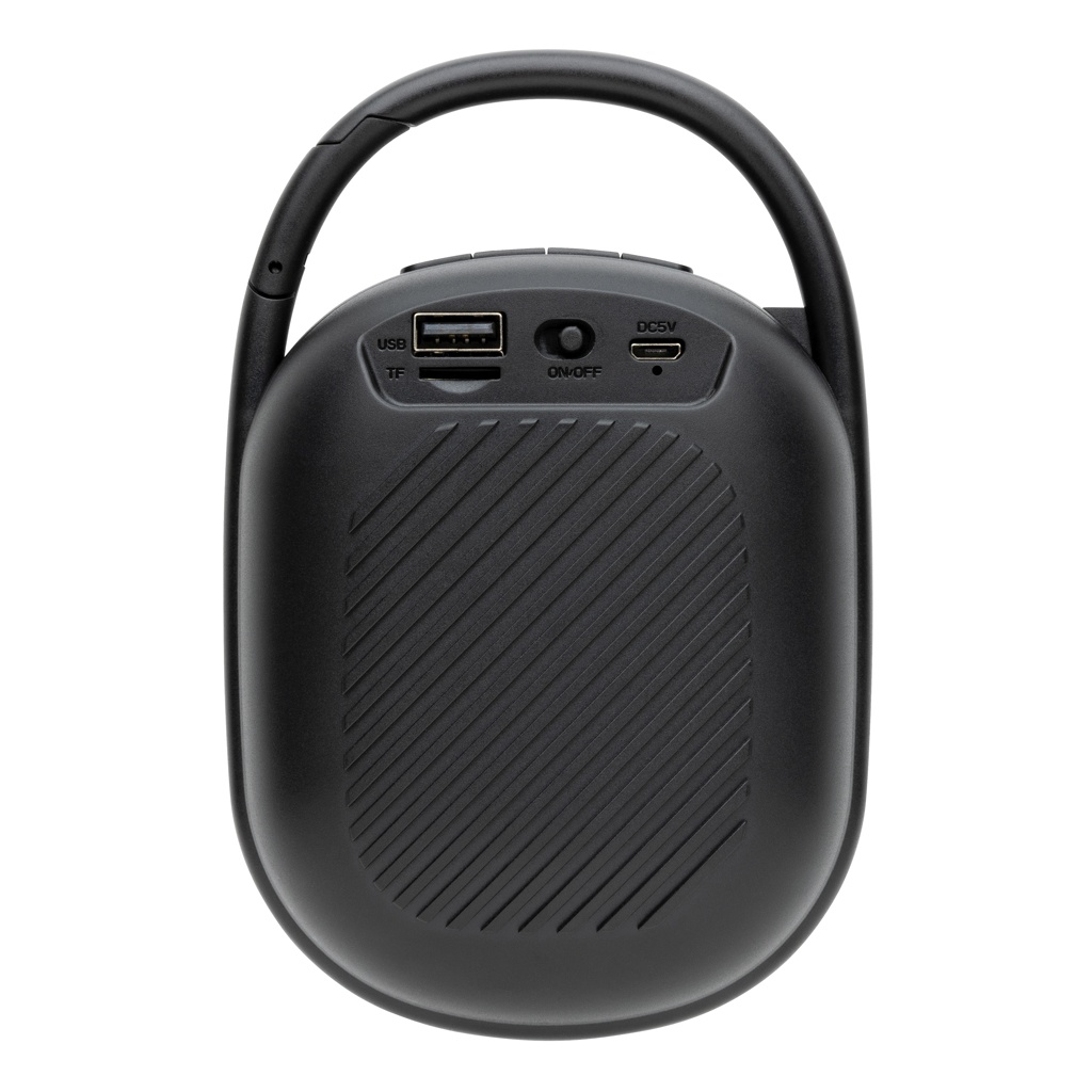 Kannettava mutta silti tehokas 5" kaiutin sisäänrakennetulla RGB-valorenkaalla. Kuori valmistettu RCS kierrätetystä ABS-muovista. Kierrätetyn materiaalin kokonaismäärä: 36% perustuen tuotteen painoon. 1200mAh litiumakku jopa 6 tunnin toistoajalla. Akun lataus kestää noin 4 tuntia. Sisäänrakennettu mikrofoni puheluita varten. Sisäänrakennettu TF-lukko ja USB-portti. BT 5.0 sulavan toiminnan takaamiseksi jopa 10 metrin etäisyydeltä. Kaiuttimessa on klipsi, jolla sen voi kiinnittää reppuun tai mihin tahansa toiseen esineeseen. Sisältää PVC-vapaan kierrätetystä TPE:stä valmistetun latauskaapelin. Tuote ja lisätarvikkeet 100% PVC-vapaita. Toimitetaan FSC-sekoituksesta valmistetussa pakkauksessa.
