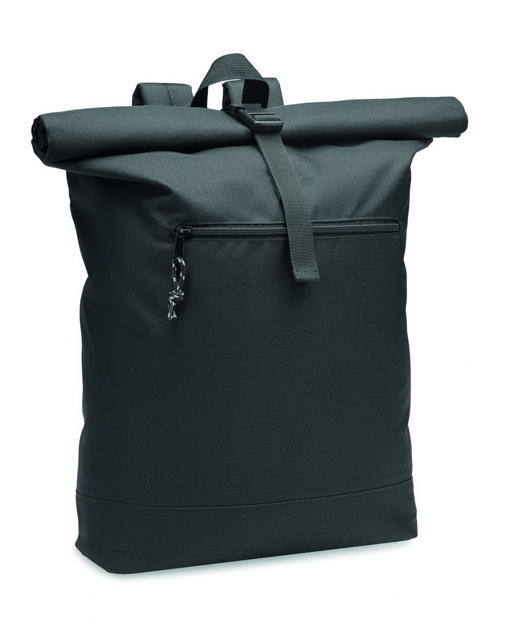 Reppu 600D RPET-polyesteriä, jossa on pehmustettu selkä ja pohjavahvistus. Vetoketjullinen etutasku. Vuori on RPET 210D RPET:tä. Reppu suljetaan yläreunasta rullaamalla.