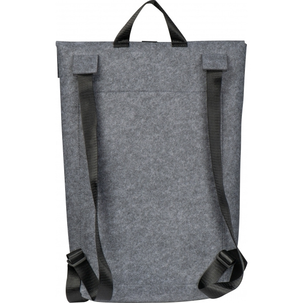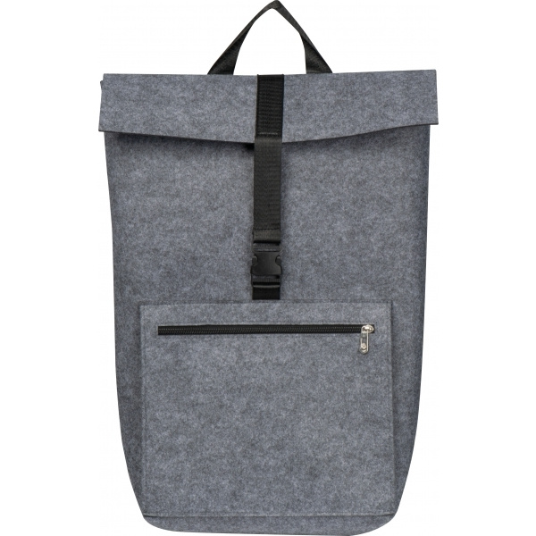 Laadukas reppu kierrätetystä huovasta. Tilavan, säädettävällä suljetulla sisälokerolla lisäksi siinä on vetoketjullinen etutasku ja säädettävät pehmustetut olkaimet. Logosi asetetaan etulokeroon.