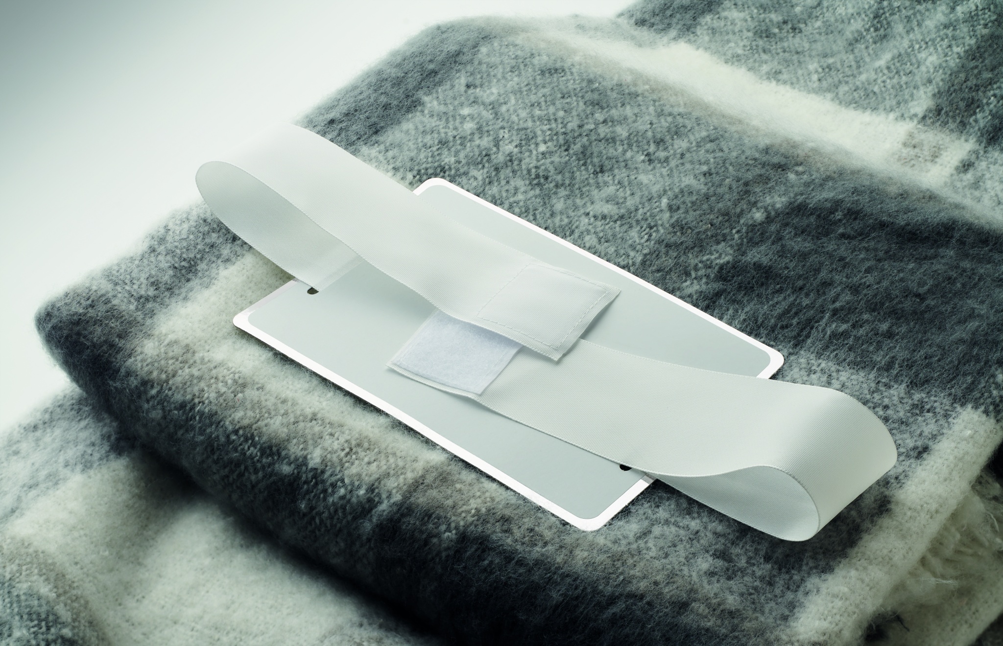 Ruudullinen mohair- RPET polyesterihuopa, jossa on käsin rullattuja hapsuja. Kääritty nauhaan ja tulostettavaan korttiin.