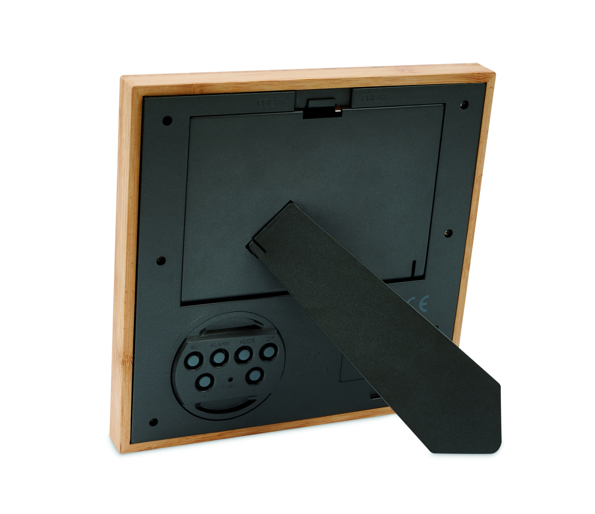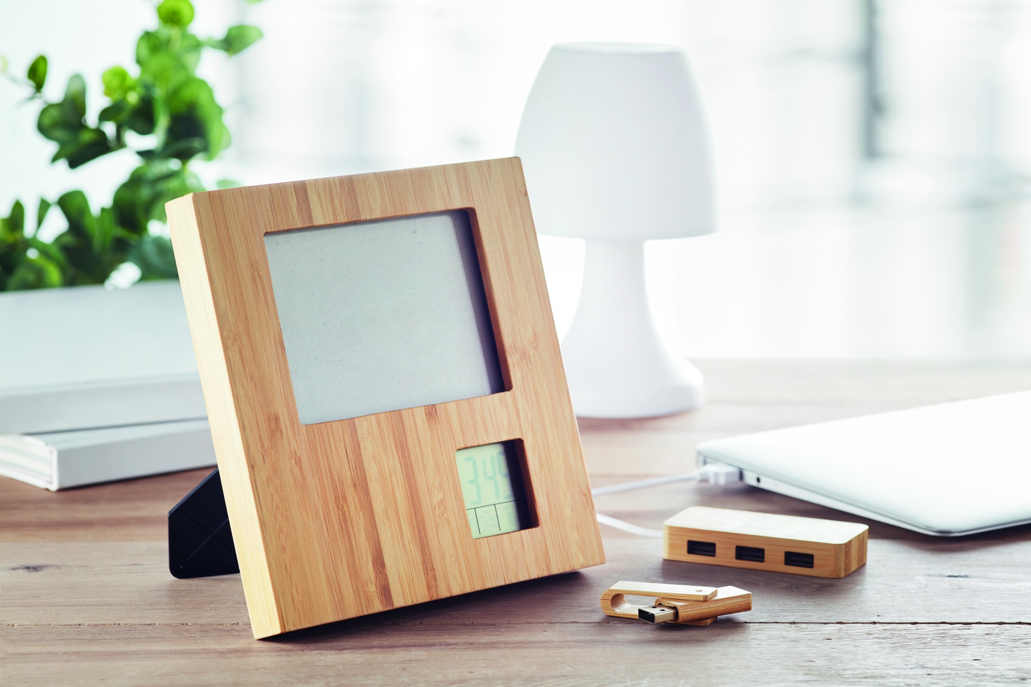Bambusta valmistettu sääasema valokuvakehyksellä. Näyttää ajan, päivämäärän ja lämpötilan, herätyskello/ ajastin toiminto. Luonnollisen materiaalin (bambu) vuoksi, tuotteiden värissä/ koossa saattaa olla erinäisyyksiä ja tämä voi vaikuttaa painatuksen lopputulokseen. 2 AAA patteria ei sisälly toimitukseen.