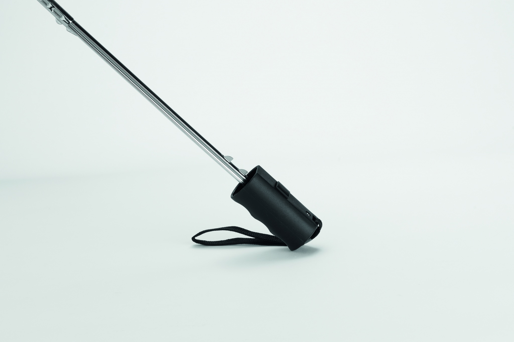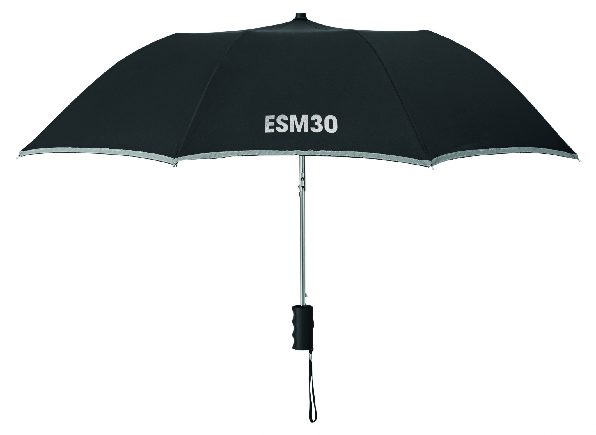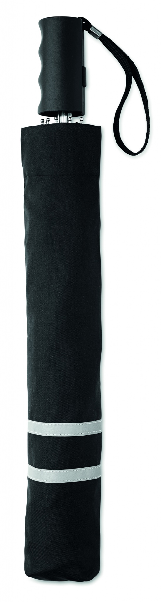 190T-pongee 2 osainen 21 tuuman sateenvarjo, automaattiavauksella. Sinkillä pinnoitetut teräsvaris, ruoteet ja kärki. Paneelien reunat heijastavalla verhoilulla, musta muovikahva rannehihnalla. Sisältää saman värisen säilytyspussin, manuaalinen suljin.