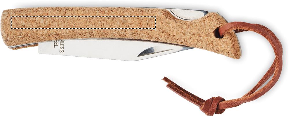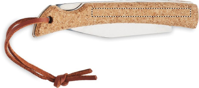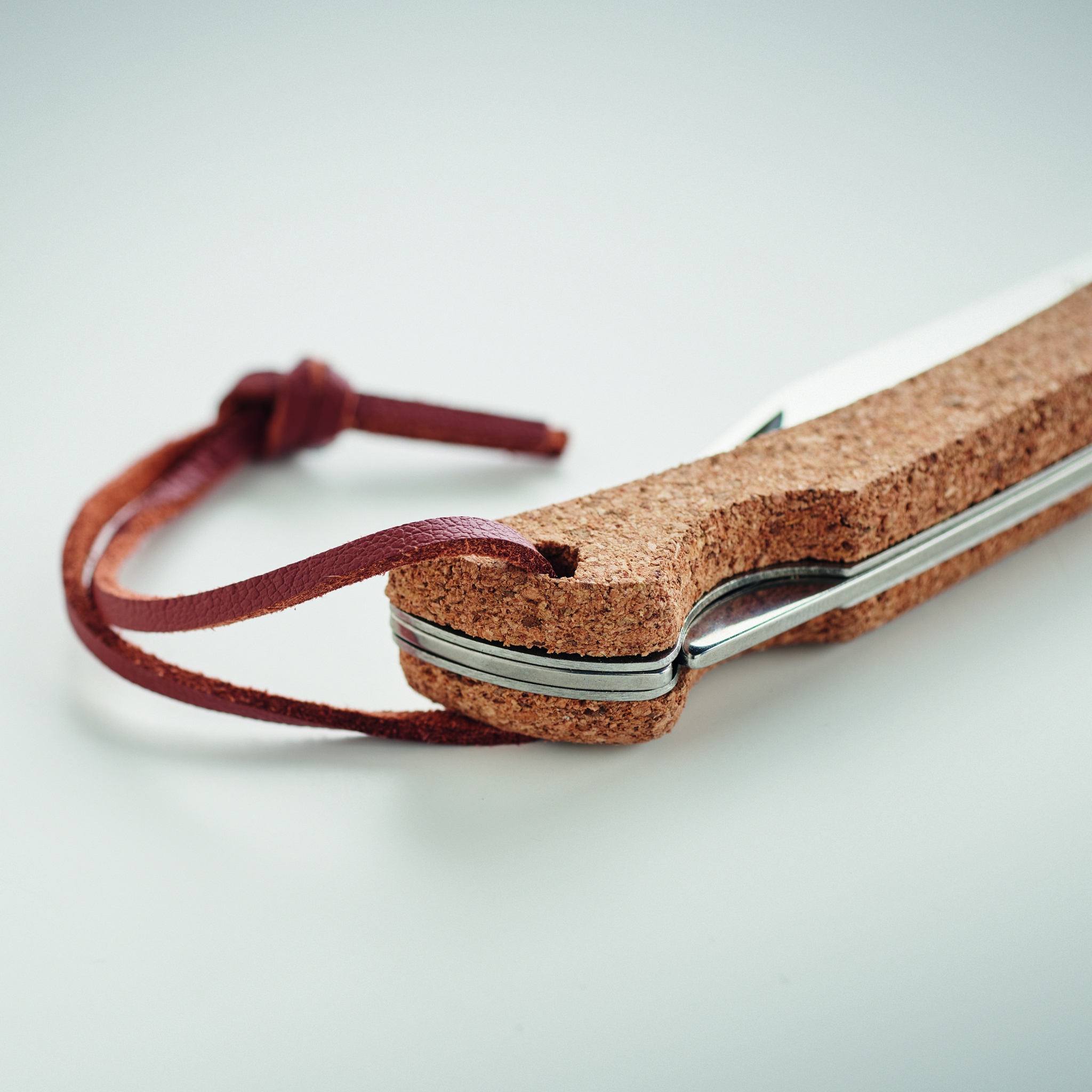 Kokoontaitettava veitsi ruostumatonta terästä ja korkilla päällystetty kahva, jossa PU-nauha.