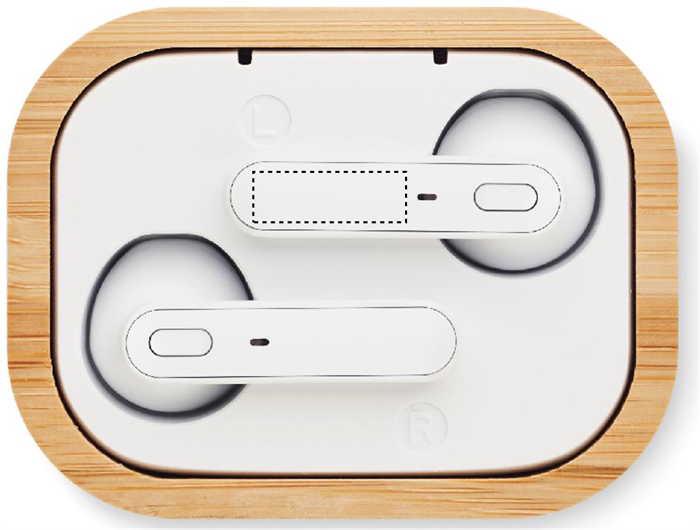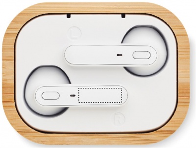 Logo trade liikelahjat mainoslahjat kuva: TWS-kuulokkeet bambukotelossa
