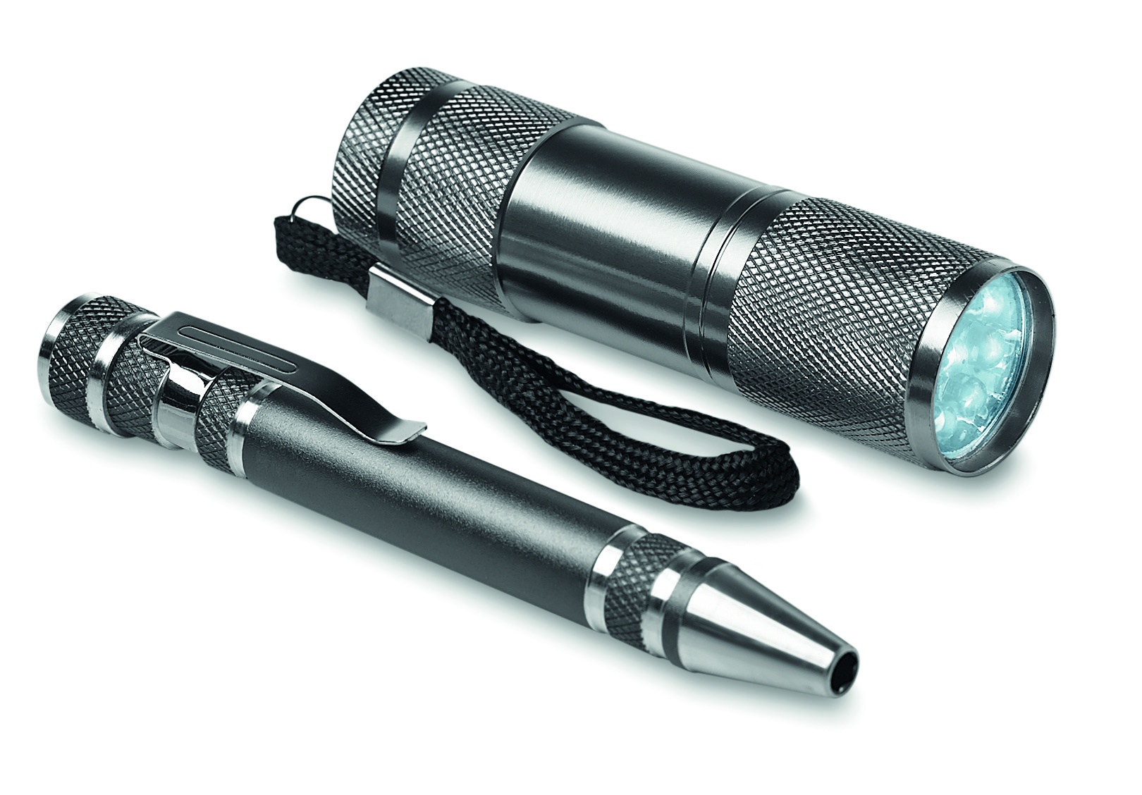 Työkalusetti 9 LED alumiinisella taskulampulla ja kynän muotoinen alumiininen monitoimityökalu. Sisältää 3 taltta- ja 3 ristipää ruuvimeisseliä. Patterit eivät sisälly toimitukseen, pakattuna lahjapakkaukseen.