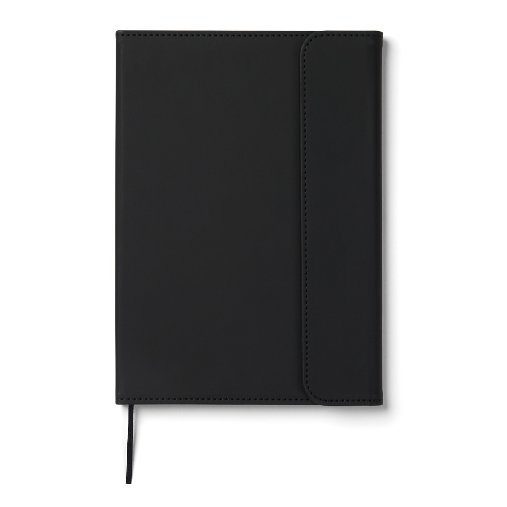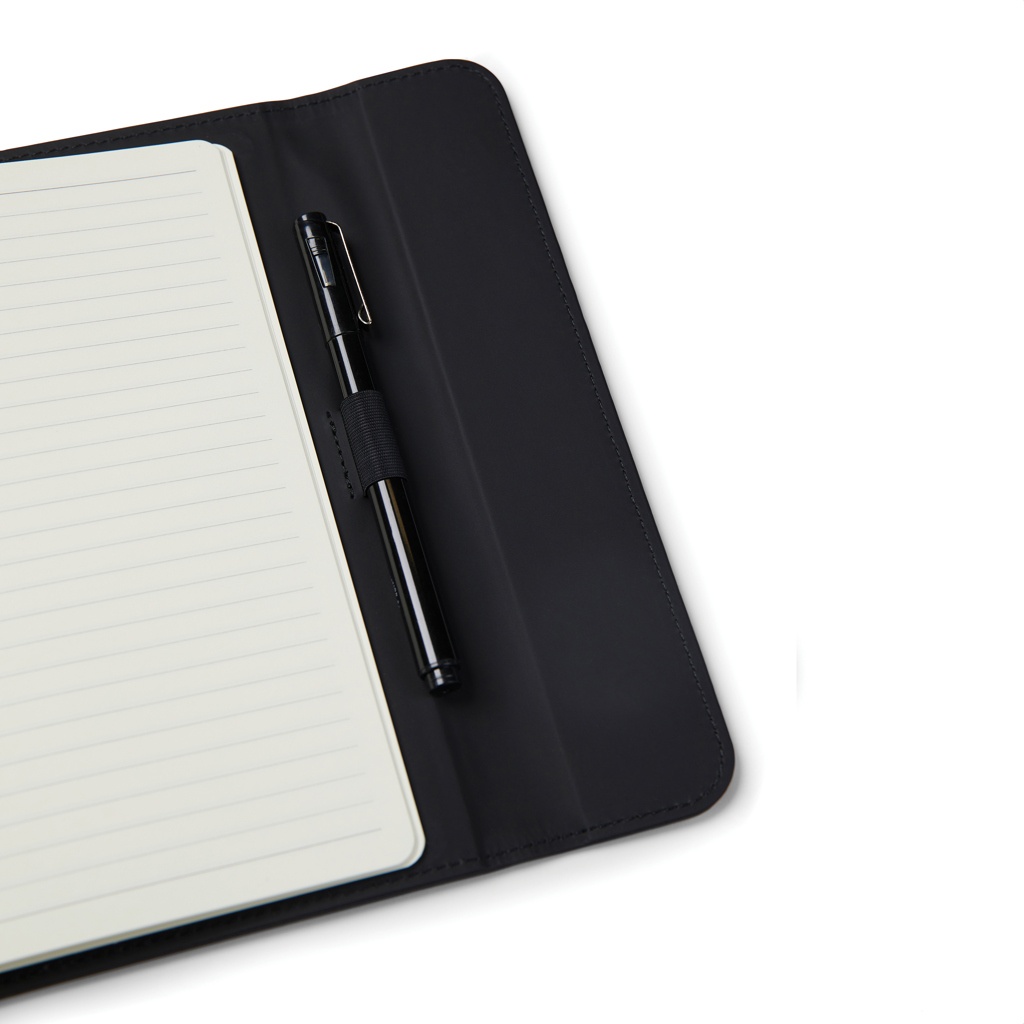 Tyylikäs ja puhdaslinjainen A5-muistikirja. Sen kansi on valmistettu 30 % kierrätetystä mattapintaisesta PU:sta, ja siinä on magneettisuljenta ja integroitu kynäpidike. Sisällä 80 sivua/160 arkkia 70 g/m² viivoitettua kierrätyspaperia, joka sopii kaikkiin muistiinpanoihisi. Paperinen sisäosa voidaan vaihtaa, mikä mahdollistaa pitkäaikaisen käytön. GRS (Global Recycled Standard) -sertifiointi takaa, että kierrätysmateriaalien koko toimitusketju on sertifioitu. Kierrätysmateriaalin kokonaismäärä perustuu tuotteen kokonaispainoon. 54 % tästä tuotteesta on GRS-sertifioitua kierrätyspaperia ja 5 % GRS-sertifioitua kierrätyshuopaa.