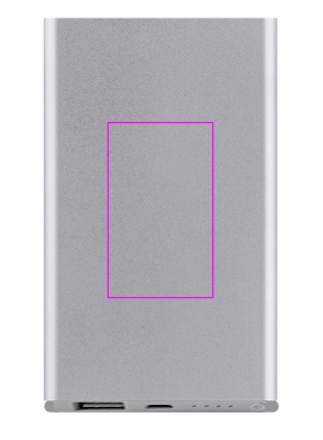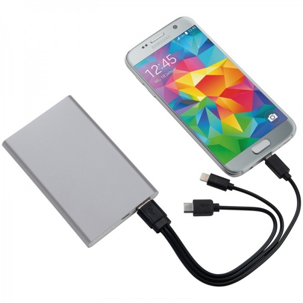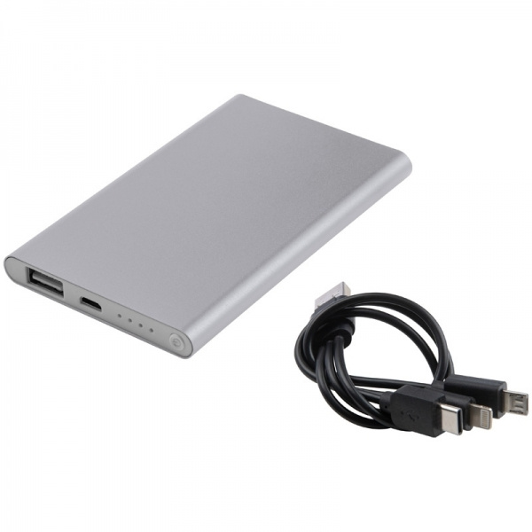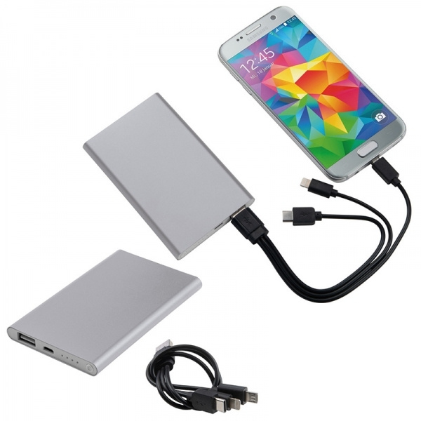 Alumiininen virtapankki 4 000 mAh latauskapasiteetilla, latauksen ilmaisin, monipistokelatauskaapeli (lightning, USB Type C ja Micro-USB.) Logosi kaiverretaan.