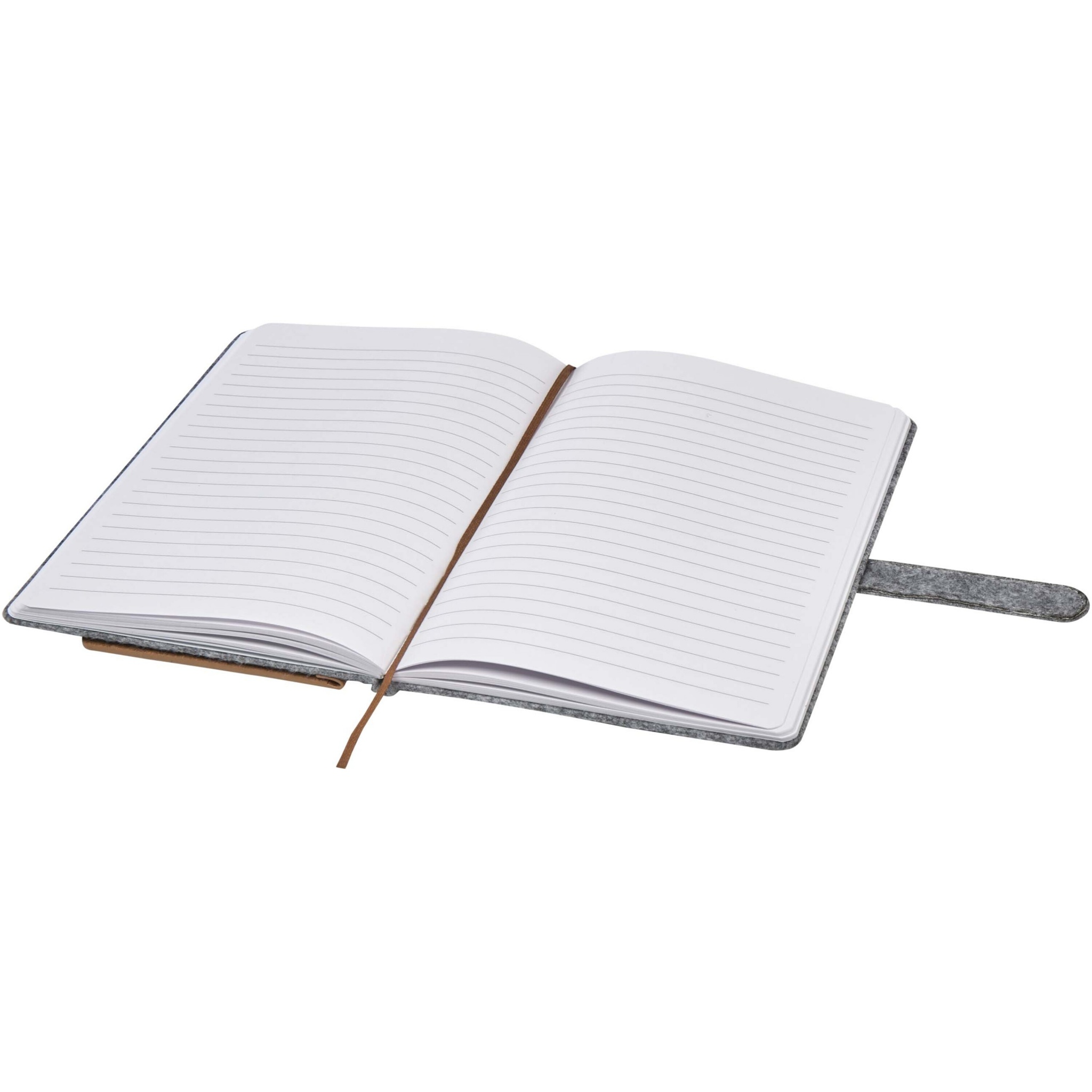 Kierrätetystä huovasta ja korkista valmistettu kovakantinen A5-muistivihko, jossa 80 viivoitettua arkkia 70 g/m²:n paperia. Muistivihkossa on 3 käyntikorttitaskua, samansävyinen ruskea nauha sekä pyöristetyt kulmat.