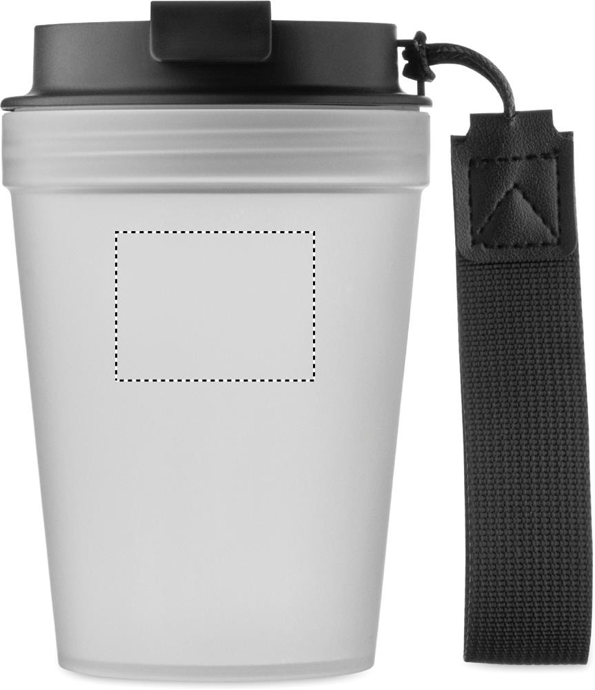 Yksiseinäinen muki PP:stä, RPET-polyesterihihna. Vuotamaton. Tilavuus: 300 ml. Koska kyseessä on yksiseinäinen muki, lämmönsiirtoa voi silti tapahtua.