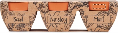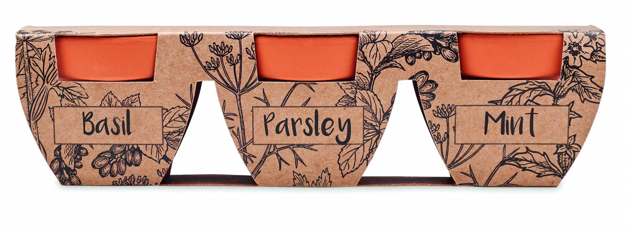 3 osainen saviterrakotta ruukkusarja, sisältää 3 erilasita yrttisiementä, basilika, minttu ja persilja.