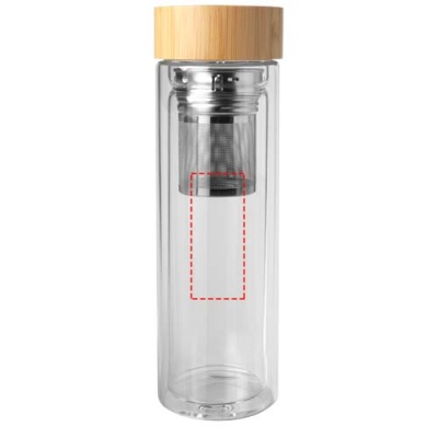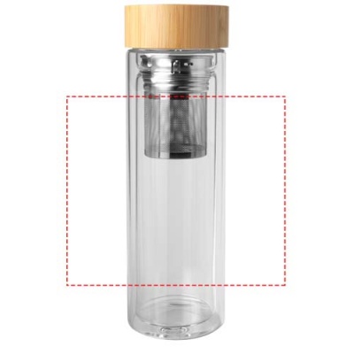 Dvigubos sienelės borosilikatinio stiklo vandens butelis su arbatos užpilu ir bambukiniu dangteliu. Naudojamas bambukas yra iš tvarių, ekologiškų ir socialiai atsakingų šaltinių. Tūrio talpa: 400 ml. Pristatoma perdirbtoje kartoninėje dėžutėje.