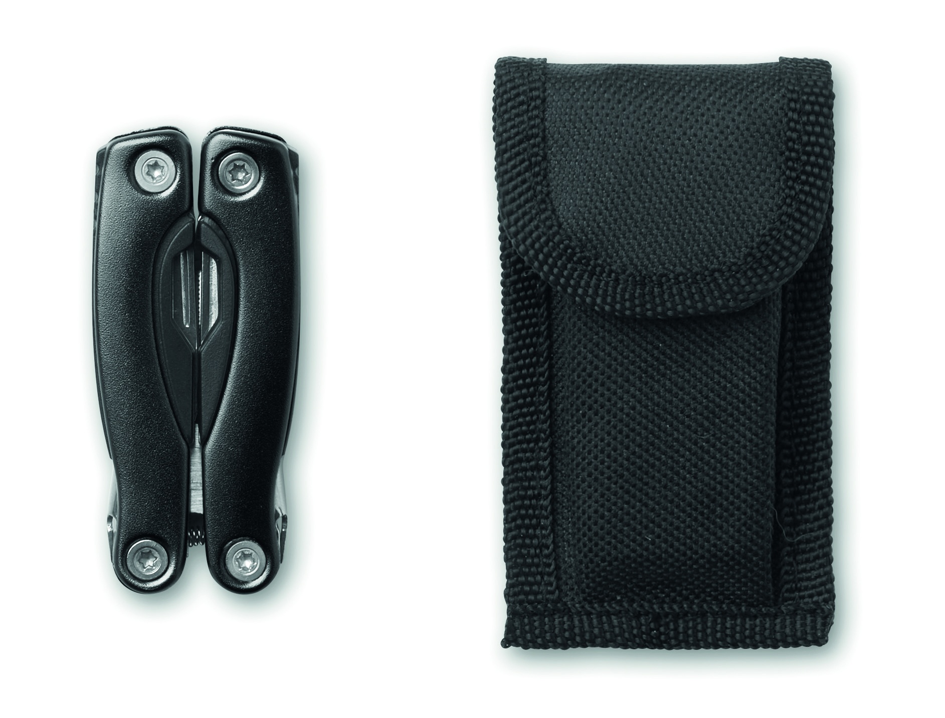 Nerūdijančio plieno sulankstomas daugiafunkcis įrankis su nerūdijančio plieno replėmis. 9 įrankių funkcijos. Komplekte 600D poliesterio maišelis.
