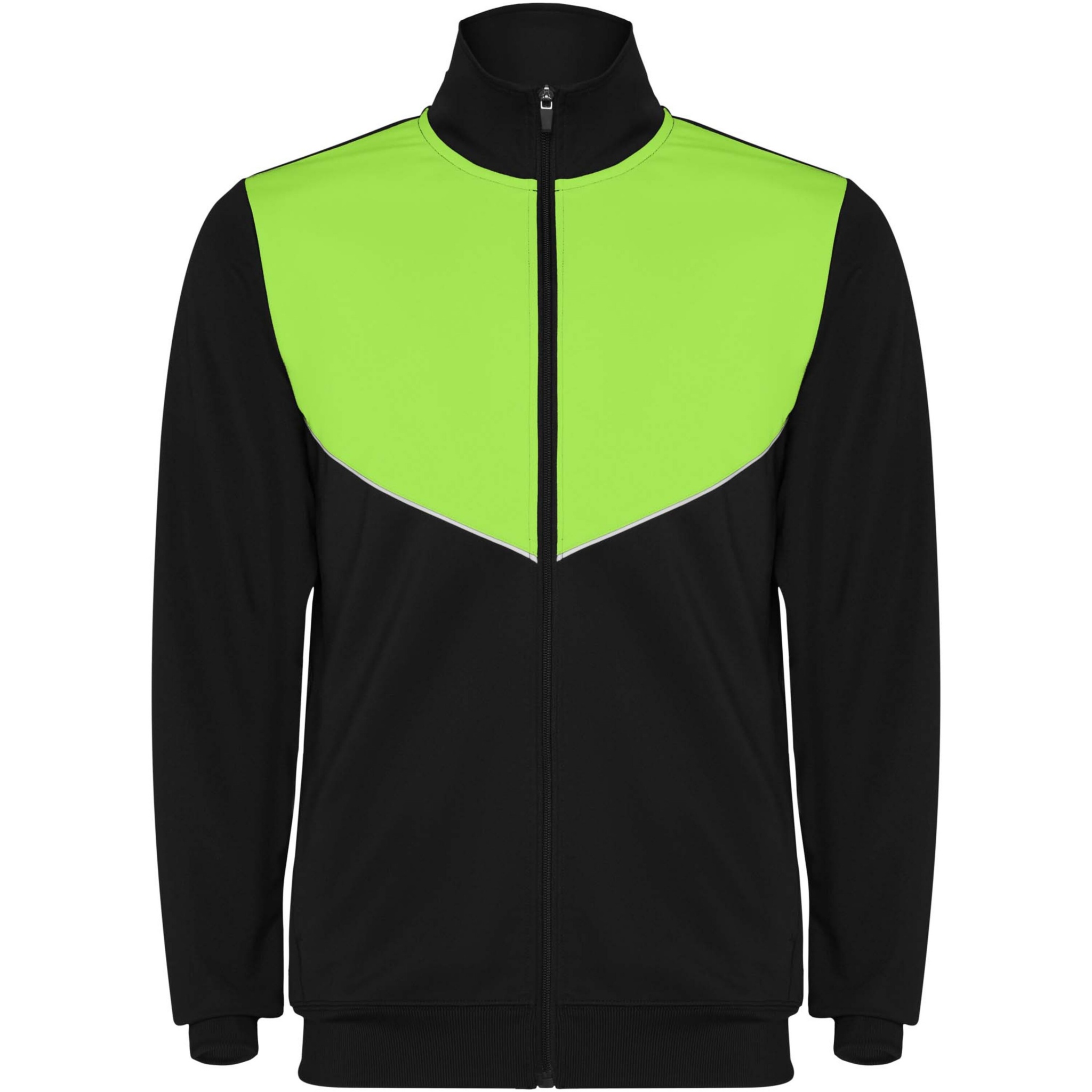 Lengvo ir elastingo audinio sportinis kostiumas. Kontrastingos spalvos striukė ir siuvami papuošimai ant krūtinės. Aukšta apykaklė su kontrastingomis siūlėmis. Centrinis priekinis užtrauktukas. Šoninės kišenės. 2x2 rumbuoti rankogaliai ir juosmuo. Kelnės su elastine juostele ir raišteliu. Kontrastinga šoninė dalis su siuvimo apdaila. Su užtrauktuku.