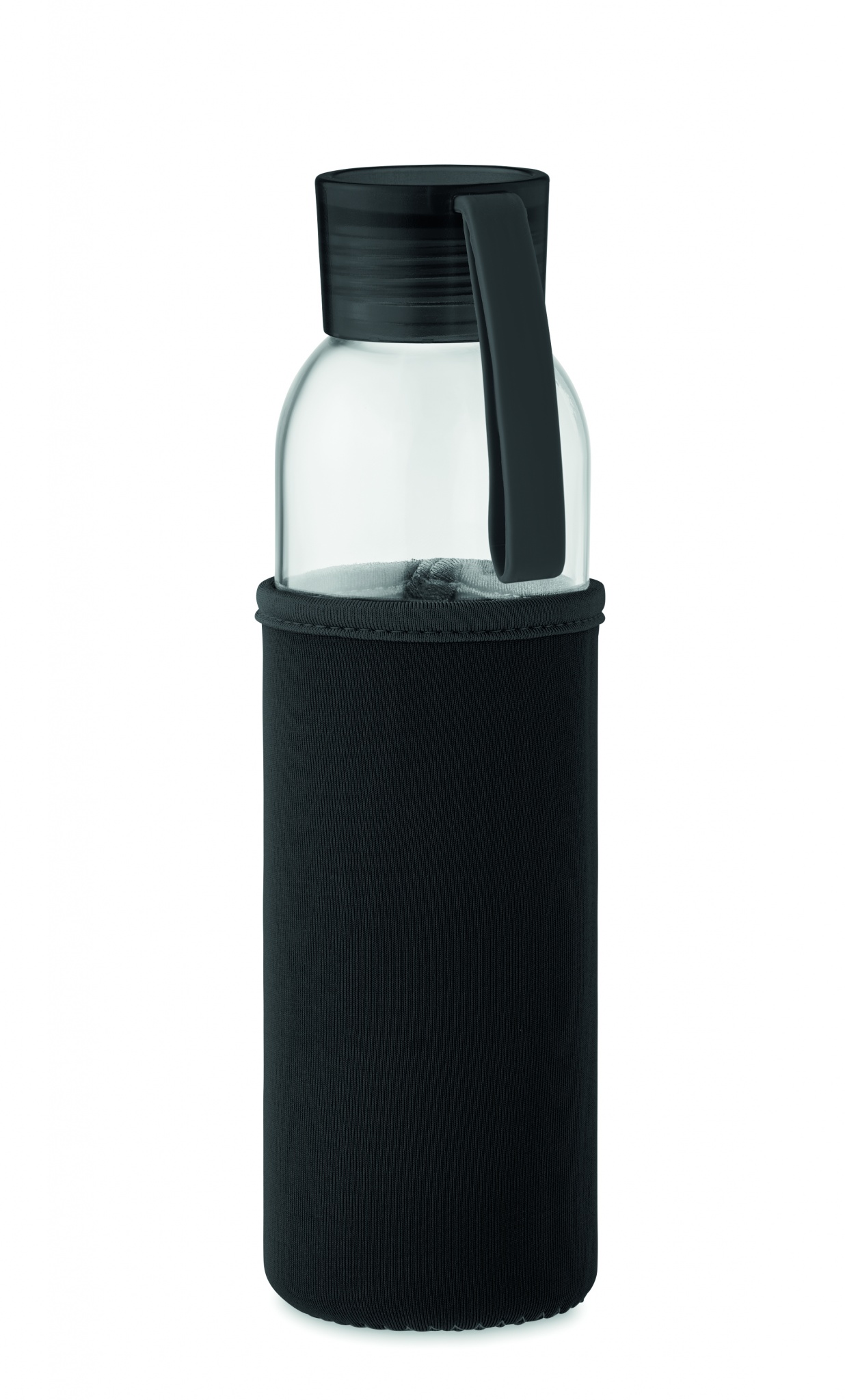 Perdirbto stiklo butelis su neopreno maišeliu ir PP dangteliu su silikonine kabykla. Nesandarus. Talpa: 500 ml.
