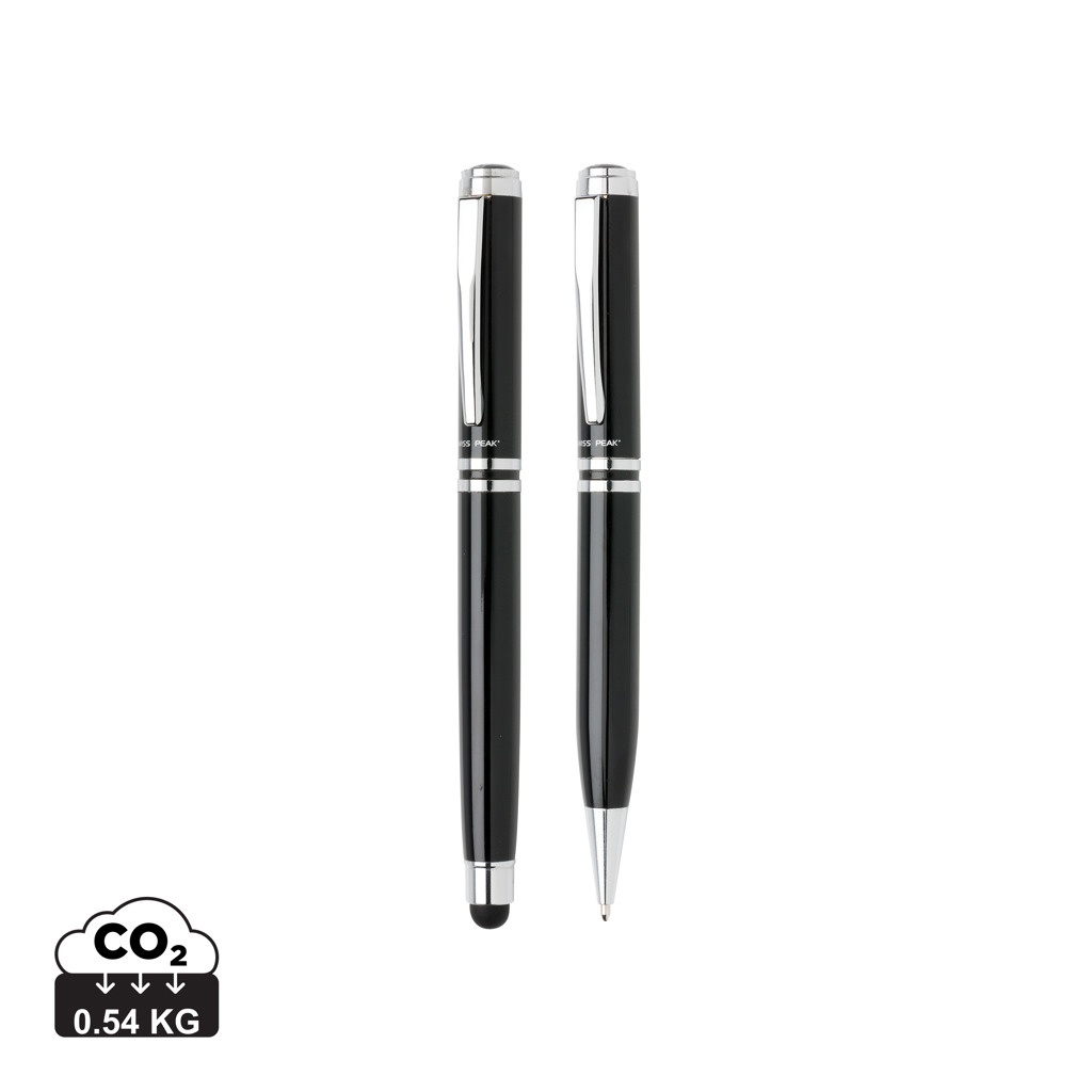 Autentiškas rašiklių rinkinys, pasižymintis visais klasikinės kokybės požymiais. Aukštos kokybės žalvarinis metalinis ritininis kamuoliukas su rašikliu ir tušinuku su Swiss Peak ženklu. Įskaitant aukščiausios kokybės PU odos maišelį ir dovanų dėžutę. Mėlynas rašalas.