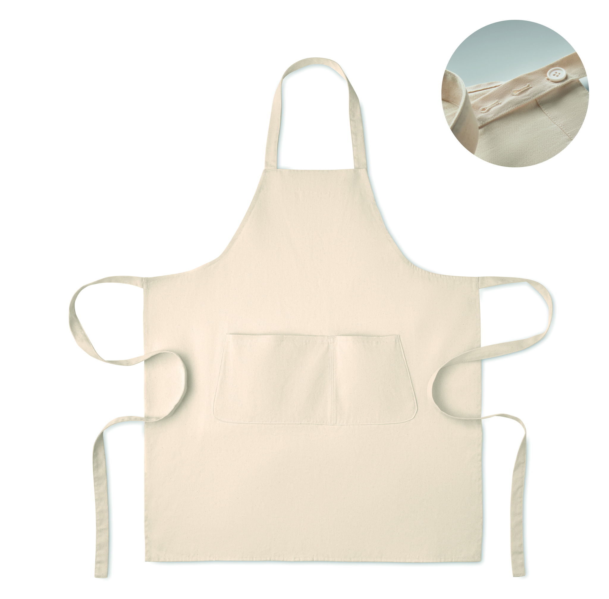 Regulējams priekšauts ar 1 lielu priekšējo kabatu un 2 nodalījumiem, izgatavots no 240 g/m² organiskās kokvilnas. Ar regulējamu pogu uz kakla siksnas. Šis produkts ir sertificēts atbilstoši OEKO-TEX® STANDARD 100 prasībām.
