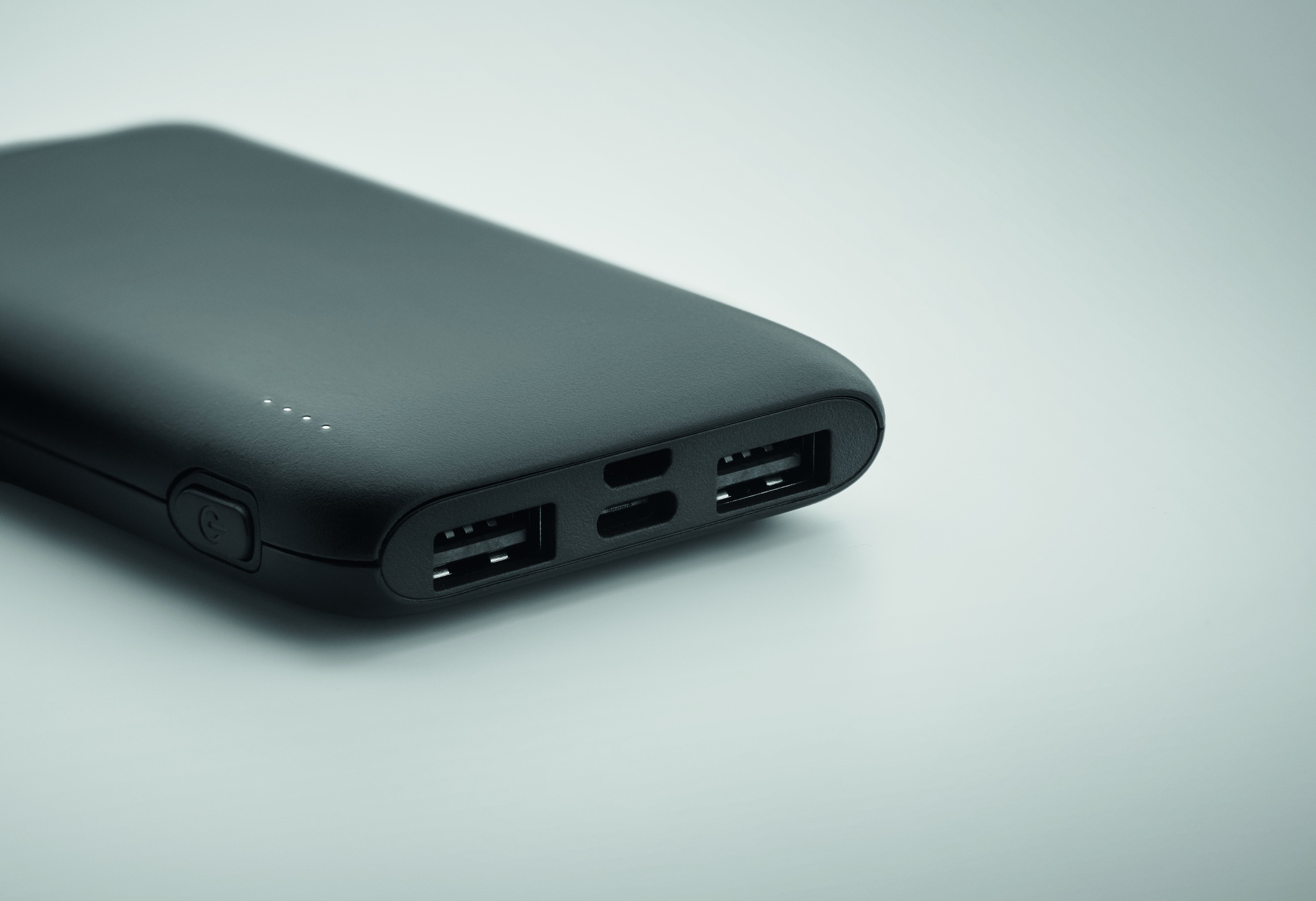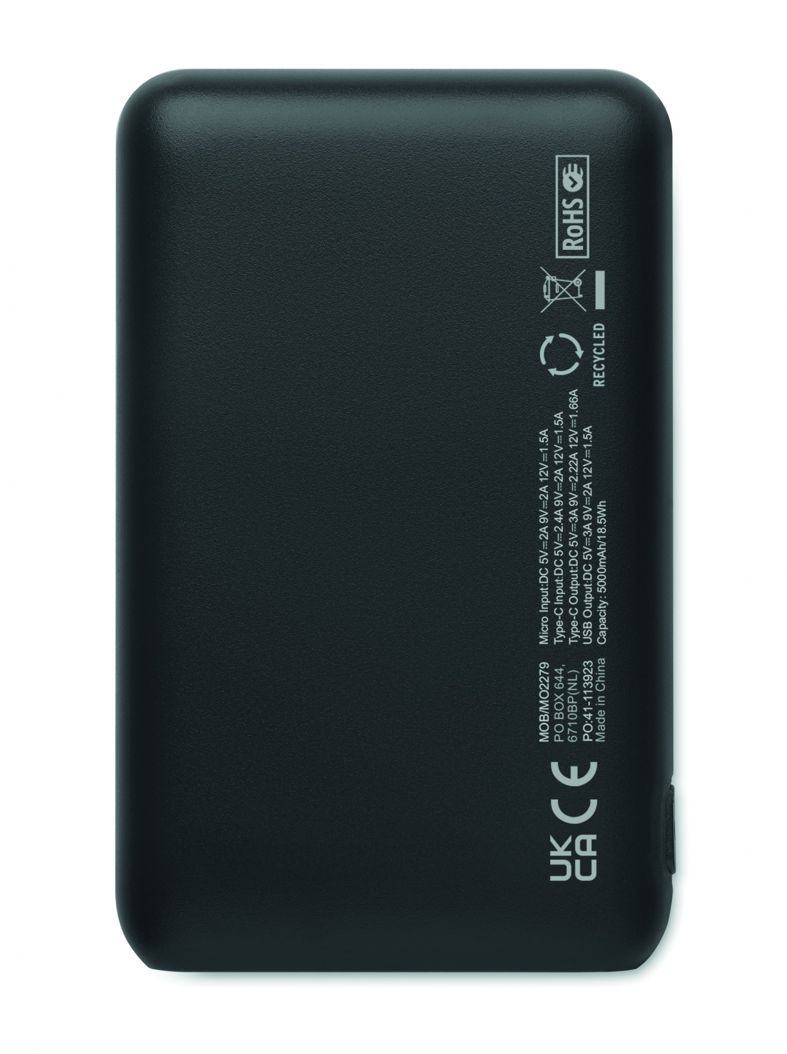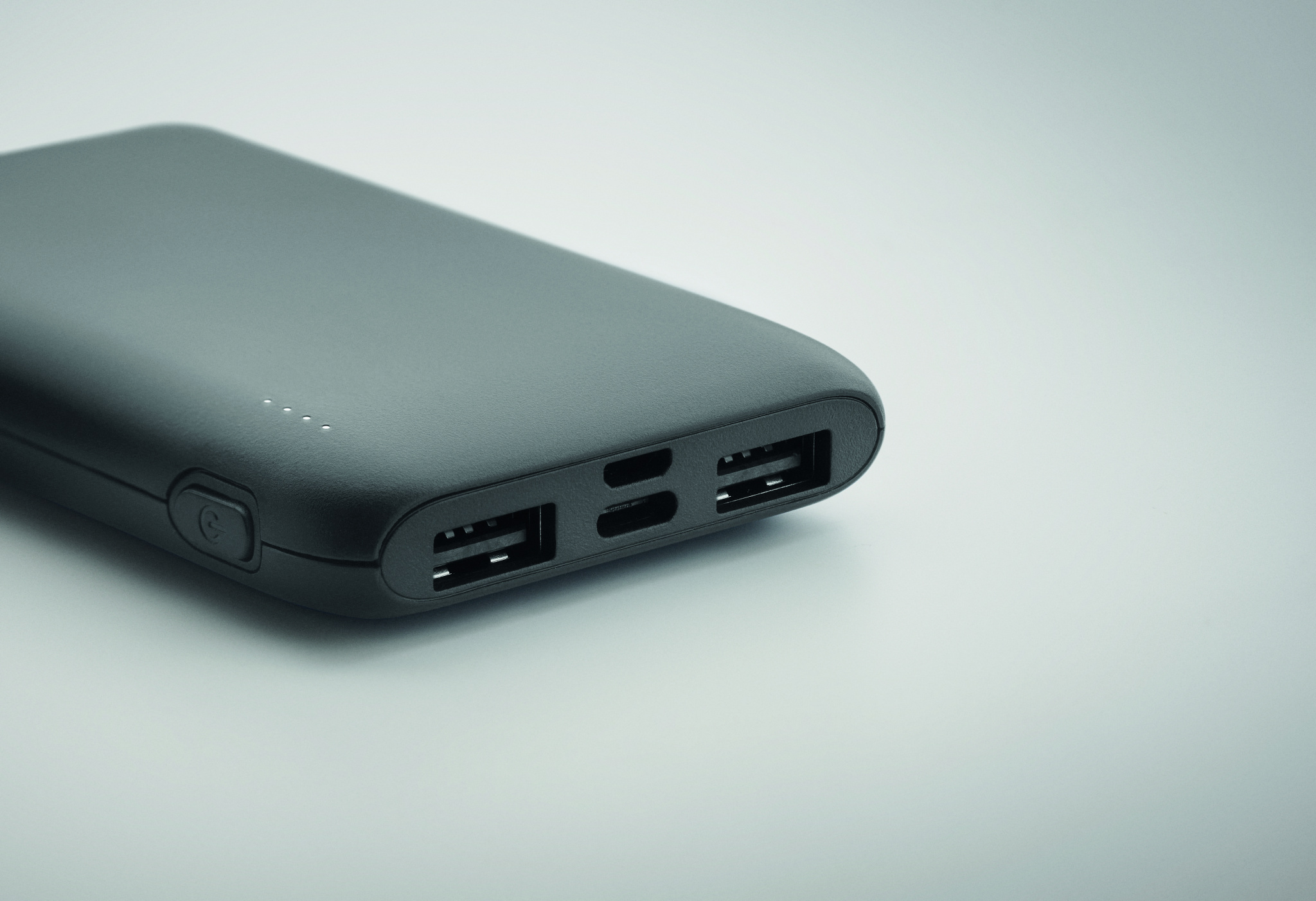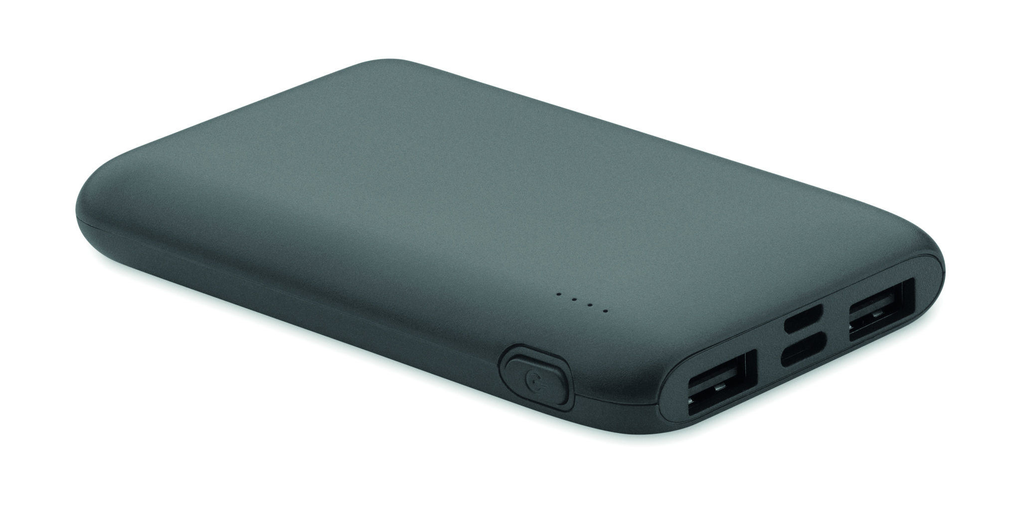 Jaudas banka 5000 mAh no pārstrādāta ABS. Ietilpība lietošanai viedtālrunī, izvade: 1 x Type-C, 2 x Type-A un 1 x Type-B. Ievade: C tipa un A tipa divi vienā.