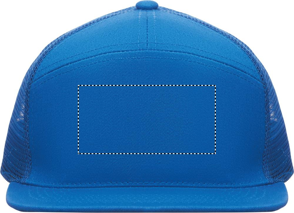 7 panel flat visor cap in cotton twill 235 gr/m² with polyester mesh backside and plastic closure.