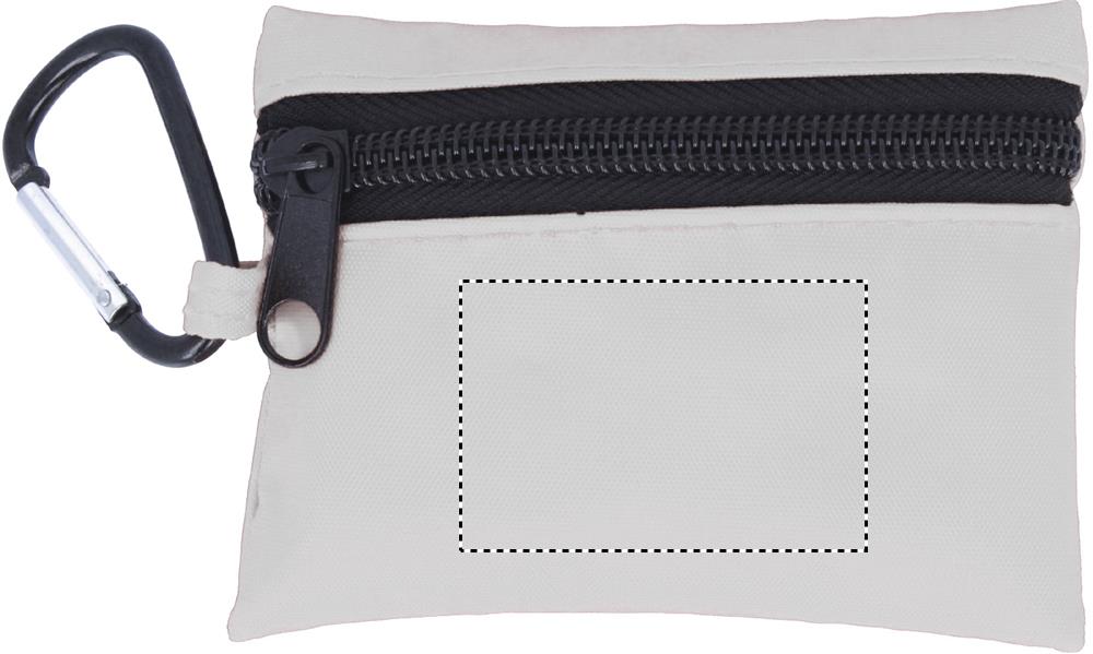 Аптечка для оказания первой помощи включает: ножницы, влажную салфетку, марлевый бинт, 3 ватных тампона и 5 пластырей. Упакована в чехол из полиэстера с молнией и карабином.